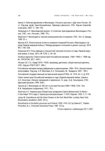 6. Гальперина Б.Д. Взаимоотношения России и Финляндии в царствование Николая II до начала Первой мировой войны (1894-1914 гг.) // Политическая история России XX века. К 85-летию профессора В.И. Старцева. СПб.: Изд-во РГПУ им. А.И. Герцена, 2016. С. 46-50. EDN: XWGJGN