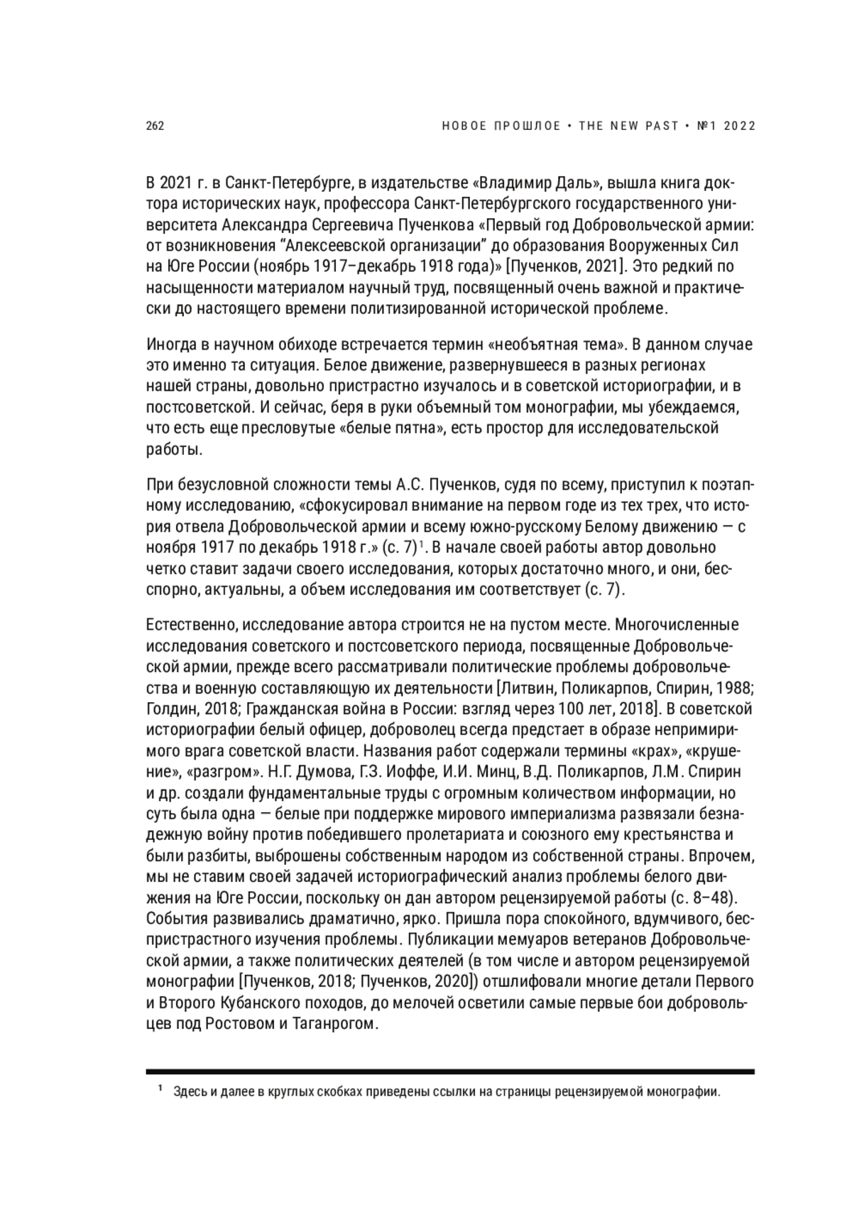 В предлагаемой рецензии дается обзор монографии доктора исторических наук, профессора Санкт-Петербургского государственного университета А. С. Пученкова «Первый год Добровольческой армии: от возникновения “Алексеевской организации” до образования Вооруженных Сил на Юге России (ноябрь 1917–декабрь 1918 года)», вышедшей в 2021 г. в издательстве «Владимир Даль» в Санкт-Петербурге. Предполагается, что это начало кропотливого поэтапного исследования внутренней жизни Добровольческой армии на всем протяжении Гражданской войны, но пока что автор сосредоточился на первом годе существования данной армии и военно-политического движения. В изданном труде А. С. Пученкова даны тонкие психологические портреты вождей Добровольческой армии, проанализированы их взаимоотношения, а также влияние этих взаимоотношений на политику Белого движения и на практику его борьбы. Большое внимание уделено взаимоотношениям между лидерами добровольческого движения и белого казачьего движения, хотя конфликт между ними достиг своего апогея уже в 1919 г. Описывая ход военных действий на Юге России в 1918 г., автор осветил многие до сих пор слабо изученные вопросы — ситуацию на Кубани внутри советских сил, конфликт между партийным руководством и главкомом И. Л. Сорокиным. В целом работа отличается большой точностью в деталях и привлечением значительного корпуса источникового материала