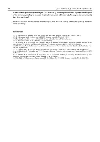 Абдинов Д. Ш., Алиева Т. Д., Ахундова Н. М., Абдинова Г. Д., Тагиев М. М., Бархалов Б. Ш. Влияние поверхностного нарушенного слоя на термоэлектрические свойства кристаллов Bi2Te2.7Se0.3, Bi0.5Sb1.5Te3 и термоэлементов на их основе 47
