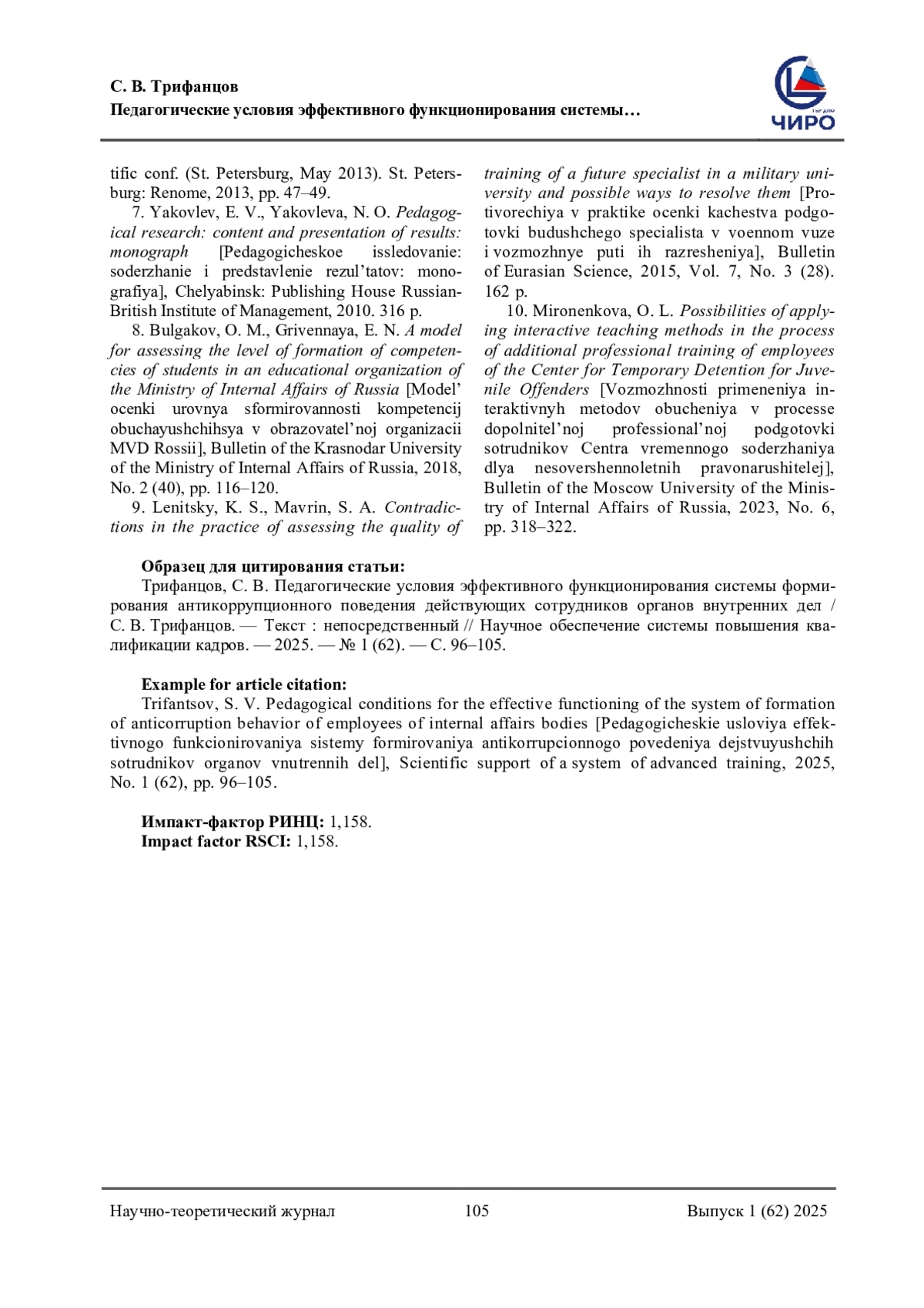 9. Леницкий, К. С. Противоречия в практике оценки качества подготовки будущего специалиста в военном вузе и возможные пути их разрешения / К. С. Леницкий, С. А. Маврин. - Текст: непосредственный // Вестник евразийской науки. - 2015. - Т. 7, № 3 (28). - С. 162. EDN: UMFYNP