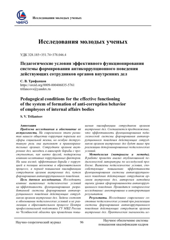 Проблема исследования и обоснование ее актуальности. На современном этапе развития нашего общества коррупция поразила все сферы социальной жизни, но особую деструктивную роль она выполняет в правоохранительных органах. Сотрудники органов внутренних дел, находясь в авангарде борьбы с преступностью, как никто другой, подвержены влиянию негативных коррупционных факторов. На наш взгляд, эффективная борьба с коррупцией в полиции возможна в образовательном процессе, в период повышения квалификации сотрудников органов внутренних дел, путем формирования антикоррупционного поведения. Цель данного исследования. Исследовать влияние выявленных педагогических условий на эффективность функционирования разработанной системы формирования антикоррупционного поведения действующих сотрудников органов внутренних дел. Задачи состоят в обосновании педагогических условий и их реализации в образовательном процессе Центра профессиональной подготовки ГУ МВД России по Челябинской области при проведении повышения квалификации сотрудников органов внутренних дел. Составляется предположение, что эффективность функционирования педагогической системы формирования антикоррупционного поведения действующих сотрудников органов внутренних дел будет выше при реализации детерминированных педагогических условий. Методология (материалы и методы). В работе проведен анализ опубликованной педагогической литературы по исследуемой проблеме. Выявлены педагогические условия, способствующие повышению эффективности функционирования системы антикоррупционного поведения действующих сотрудников органов внутренних дел, авторская методика оценки уровня сформированности антикоррупционного поведения. Проводится эмпирическое исследование: анкетирование и интерпретация результатов. Результаты. Исследовано современное состояние педагогических условий при реализации системы формирования антикоррупционного поведения действующих сотрудников органов внутренних дел. Практическая значимость исследования заключается в выявленных формах, методах и средствах для реализации педагогических условий в процессе повышения квалификации сотрудников органов внутренних дел, а также в разработанном диагностическом инструментарии для определения уровня сформированности антикоррупционного поведения.