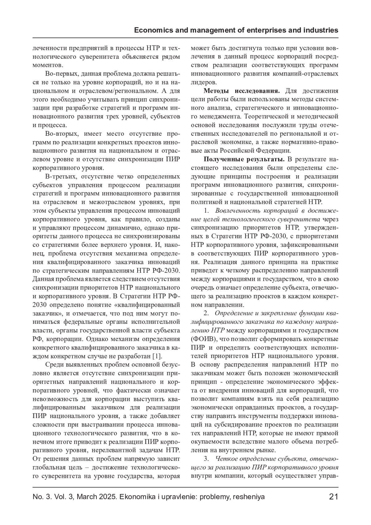 Стратегией научно-технологического развития Российской Федерации до 2030 г. закреплены приоритеты для реализации инноваций на отраслевом/региональном и корпоративном уровнях.