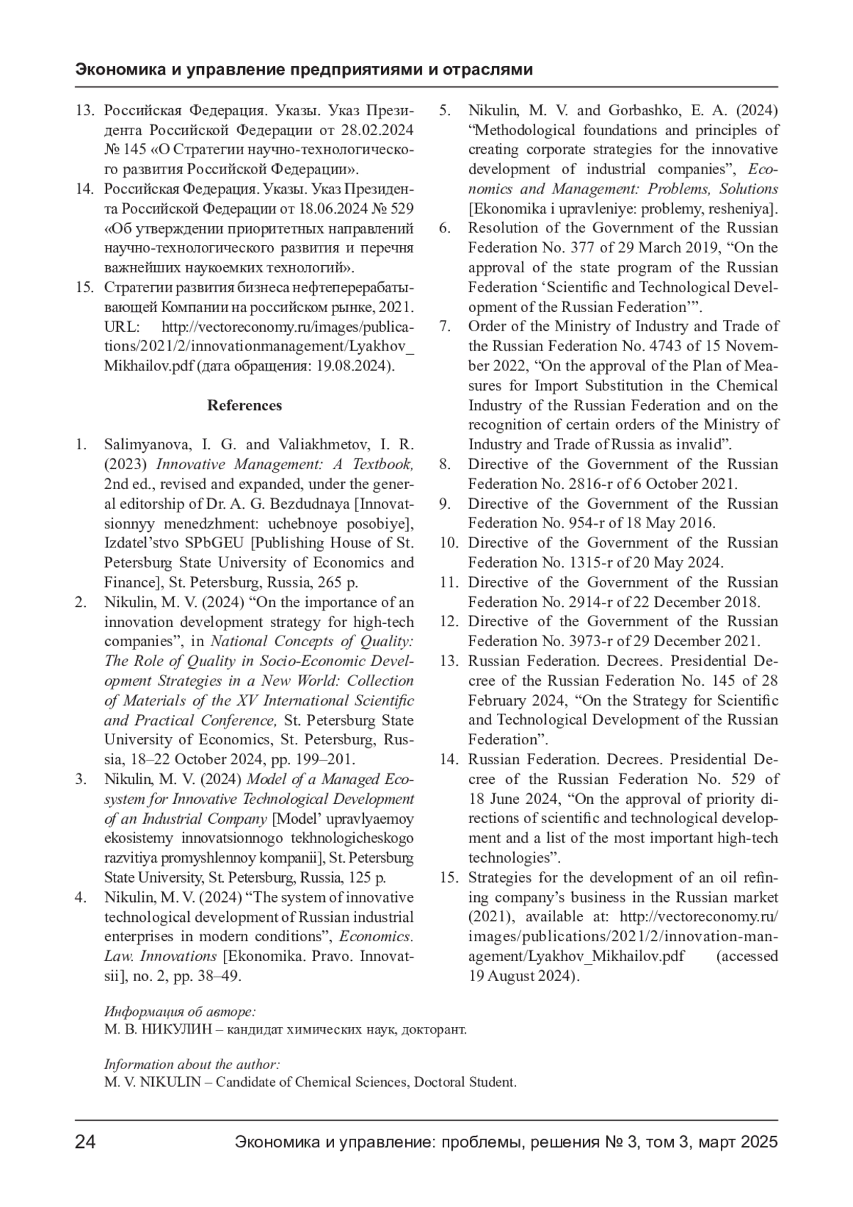 4. Никулин М. В. Система инновационного технологического развития российских промышленных предприятий в современных условиях // Экономика. Право. Инновации. - 2024. - № 2. - С. 38-49. EDN: CWESWN