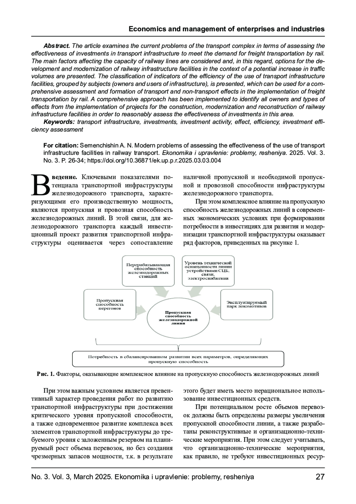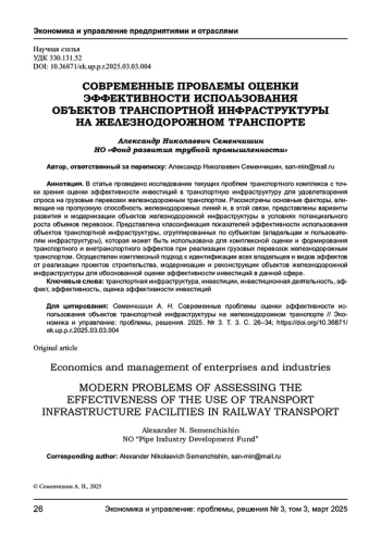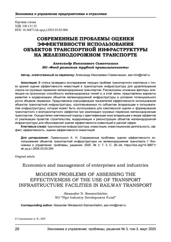 В статье проведено исследование текущих проблем транспортного комплекса с точки зрения оценки эффективности инвестиций в транспортную инфраструктуру для удовлетворения спроса на грузовые перевозки железнодорожным транспортом. Рассмотрены основные факторы, влияющие на пропускную способность железнодорожных линий и, в этой связи, представлены варианты развития и модернизации объектов железнодорожной инфраструктуры в условиях потенциального роста объемов перевозок. Представлена классификация показателей эффективности использования объектов транспортной инфраструктуры, сгруппированных по субъектам (владельцам и пользователям инфраструктуры), которая может быть использована для комплексной оценки и формирования транспортного и внетранспортного эффектов при реализации грузовых перевозок железнодорожным транспортом. Осуществлен комплексный подход к идентификации всех владельцев и видов эффектов от реализации проектов строительства, модернизации и реконструкции объектов железнодорожной инфраструктуры для обоснованной оценки эффективности инвестиций в данной сфере.