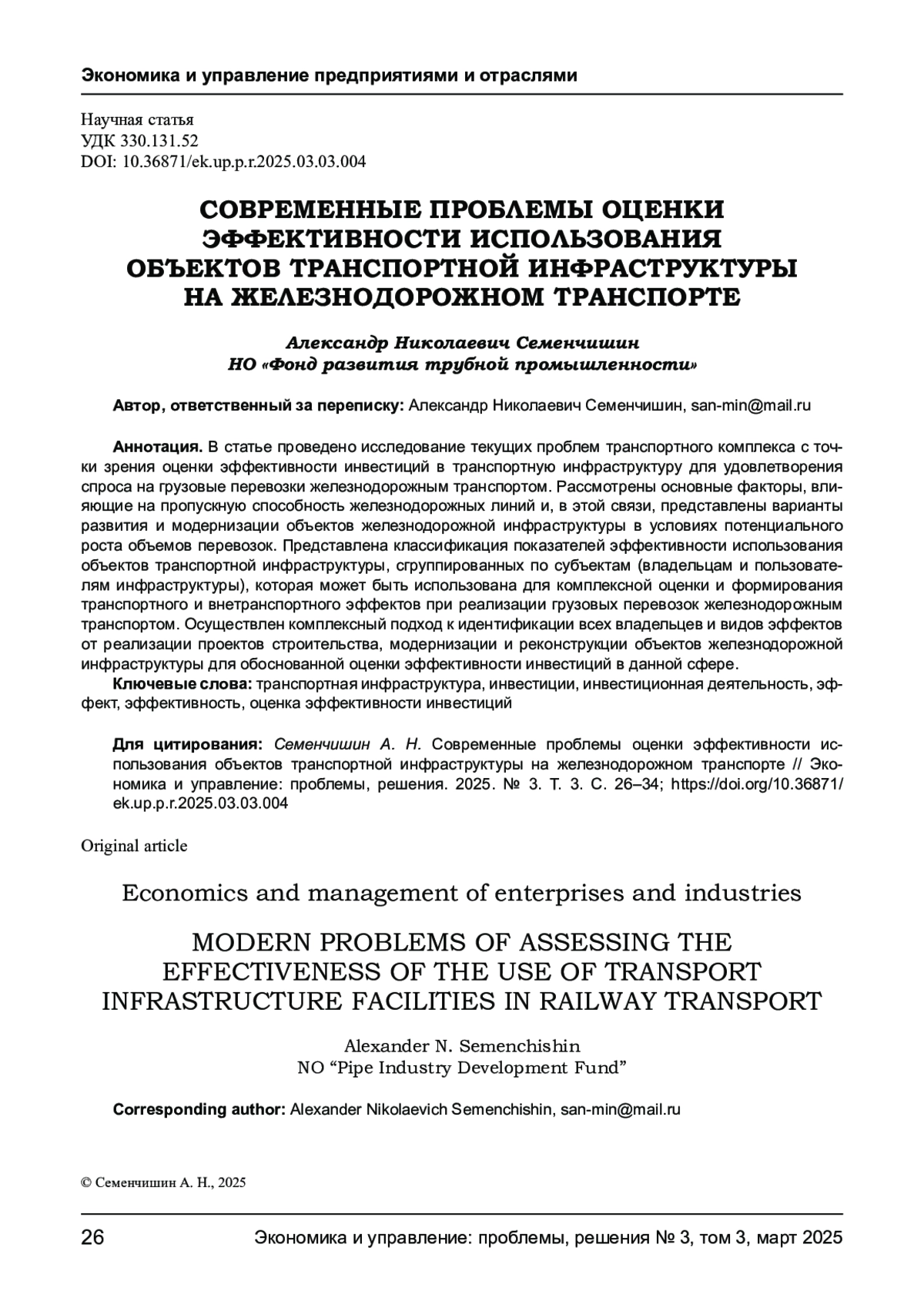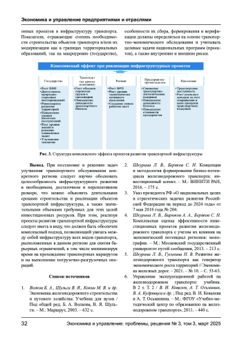 8. Семенчишин А. Н. Анализ текущего состояния транспортной инфраструктуры в РФ и основные предпосылки формирования инвестиционных процессов в области ее совершенствования // Корпоративное управление экономической и финансовой деятельностью на железнодорожном транспорте: сборник трудов по результатам VII Международной научно-практической конференции. Выпуск 21. - Москва: РУТ (МИИТ). РОАТ, 2023. - С. 238-241. EDN: BSSWAW