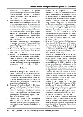 5. Шкурина Л. В., Гуськина Н. В. Развитие железнодорожного транспорта как генератор экономического роста территорий // Экономика железных дорог. - 2021. - № 10. - С. 53-63. EDN: UAEXQD