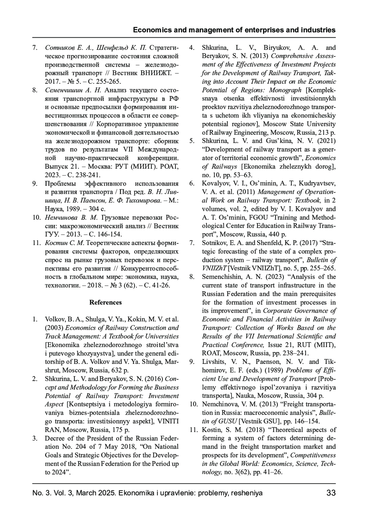 7. Сотников Е. А., Шенфельд К. П. Стратегическое прогнозирование состояния сложной производственной системы - железнодорожный транспорт // Вестник ВНИИЖТ. - 2017. - № 5. - С. 255-265. EDN: ZRDOWN