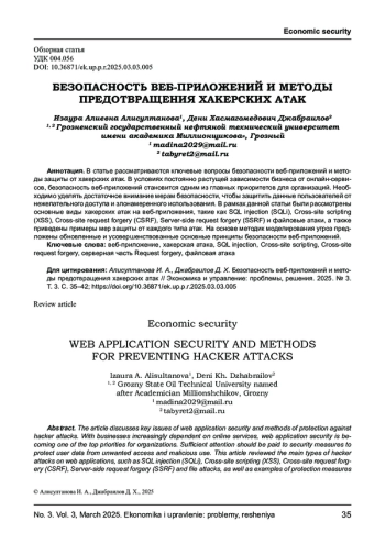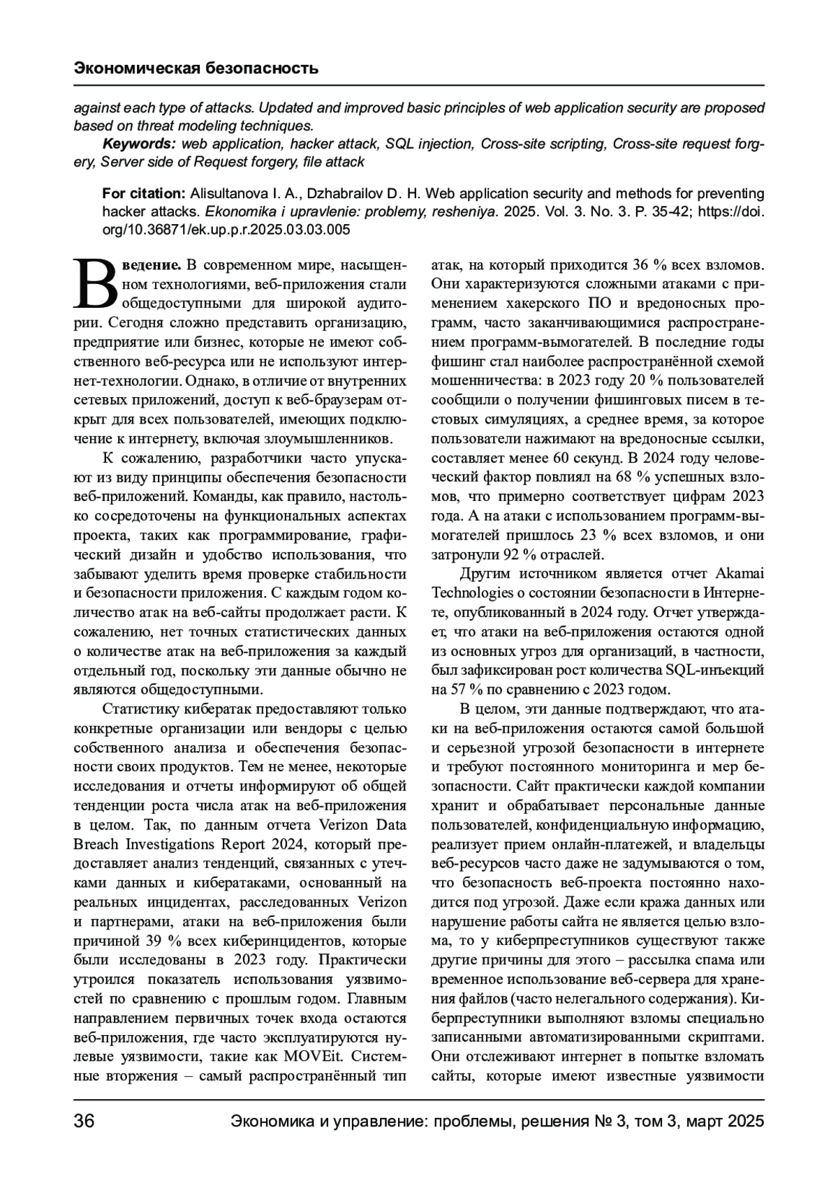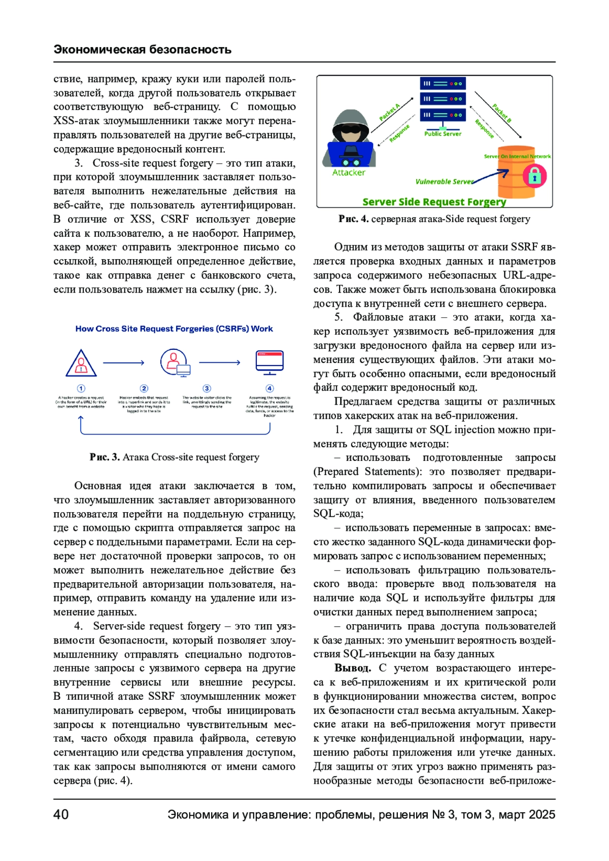 В статье рассматриваются ключевые вопросы безопасности веб-приложений и методы защиты от хакерских атак. В условиях постоянно растущей зависимости бизнеса от онлайн-сервисов, безопасность веб-приложений становится одним из главных приоритетов для организаций. Необходимо уделять достаточное внимание мерам безопасности, чтобы защитить данные пользователей от нежелательного доступа и злонамеренного использования. В рамках данной статьи были рассмотрены основные виды хакерских атак на веб-приложения, такие как SQL injection (SQLi), Cross-site scripting (XSS), Cross-site request forgery (CSRF), Server-side request forgery (SSRF) и файловые атаки, а также приведены примеры мер защиты от каждого типа атак. На основе методик моделирования угроз предложены обновленные и усовершенствованные основные принципы безопасности веб-приложений.