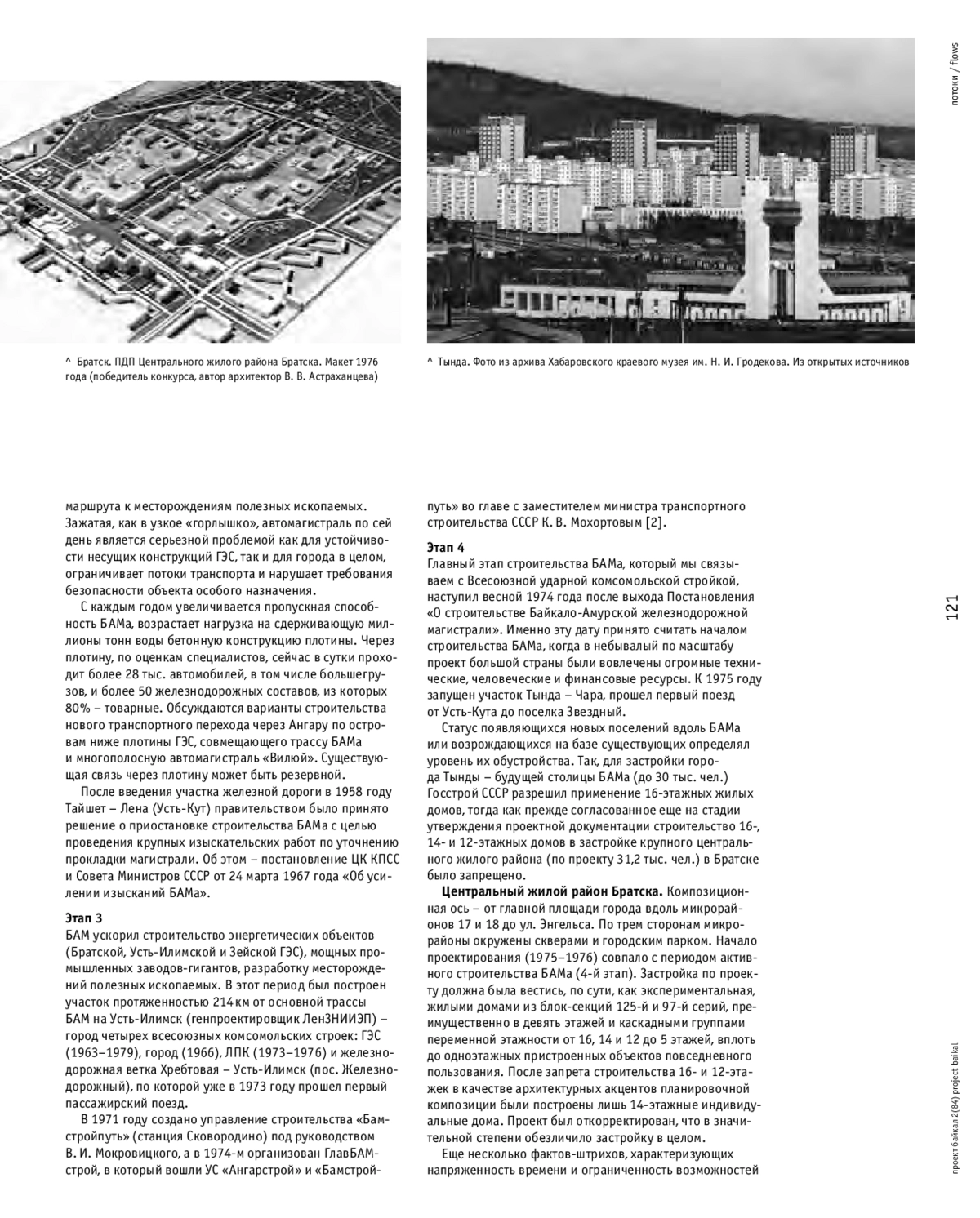 По результатам анализа хронологии прокладки путей БАМа определено пять этапов строительства магистрали с их графическим отображением на карте-схеме. Обоснованием послужил исторический контекст. На основе архивных материалов музеев, открытых источников и личных воспоминаний специалистов освещаются реализованные и неосуществленные проекты в городах и поселках БАМа в Иркутской области. Принадлежность БАМу некоторых городов и поселков первых этапов строительства не всегда очевидна и не находит достойного места в цепи событий. Изложены объективные причины и обстоятельства, на это повлиявшие. Определена градостроительная специфика поселений советского периода западного участка БАМа.