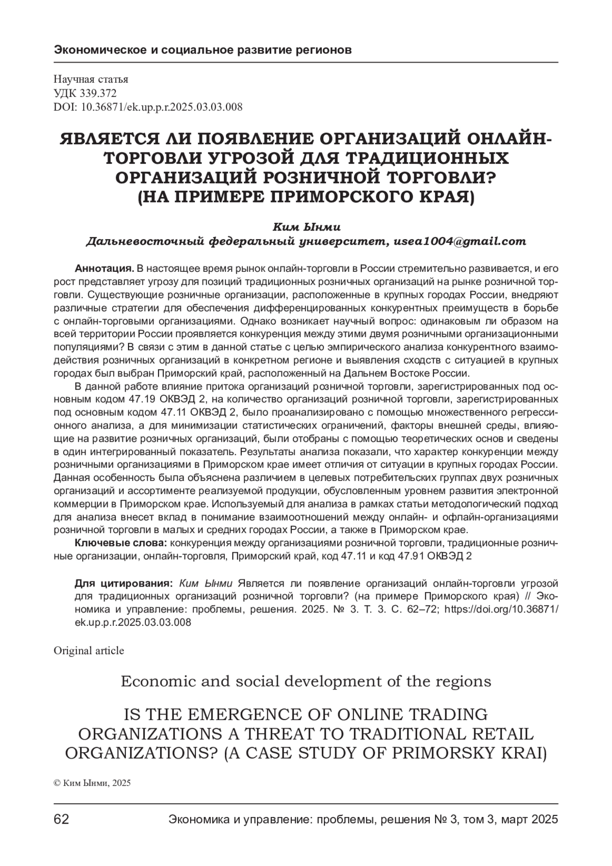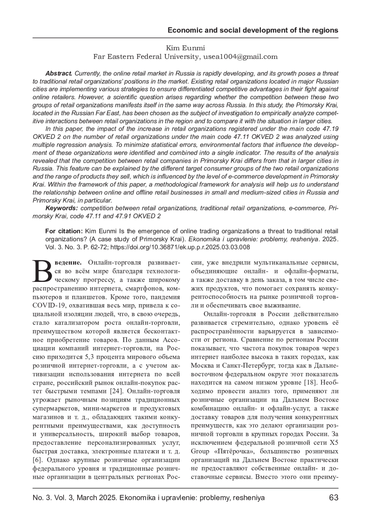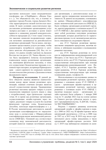 В настоящее время рынок онлайн-торговли в России стремительно развивается, и его рост представляет угрозу для позиций традиционных розничных организаций на рынке розничной торговли. Существующие розничные организации, расположенные в крупных городах России, внедряют различные стратегии для обеспечения дифференцированных конкурентных преимуществ в борьбе с онлайн-торговыми организациями. Однако возникает научный вопрос: одинаковым ли образом на всей территории России проявляется конкуренция между этими двумя розничными организационными популяциями? В связи с этим в данной статье с целью эмпирического анализа конкурентного взаимодействия розничных организаций в конкретном регионе и выявления сходств с ситуацией в крупных городах был выбран Приморский край, расположенный на Дальнем Востоке России. В данной работе влияние притока организаций розничной торговли, зарегистрированных под основным кодом 47.19 ОКВЭД 2, на количество организаций розничной торговли, зарегистрированных под основным кодом 47.11 ОКВЭД 2, было проанализировано с помощью множественного регрессионного анализа, а для минимизации статистических ограничений, факторы внешней среды, влияющие на развитие розничных организаций, были отобраны с помощью теоретических основ и сведены в один интегрированный показатель. Результаты анализа показали, что характер конкуренции между розничными организациями в Приморском крае имеет отличия от ситуации в крупных городах России. Данная особенность была объяснена различием в целевых потребительских группах двух розничных организаций и ассортименте реализуемой продукции, обусловленным уровнем развития электронной коммерции в Приморском крае. Используемый для анализа в рамках статьи методологический подход для анализа внесет вклад в понимание взаимоотношений между онлайн- и офлайн-организациями розничной торговли в малых и средних городах России, а также в Приморском крае.