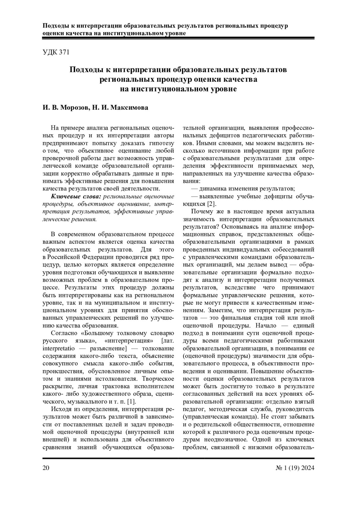 МОРОЗОВ И. В., МАКСИМОВА Н. И. ПОДХОДЫ К ИНТЕРПРЕТАЦИИ НА ИНСТИТУЦИОНАЛЬНОМ УРОВНЕ РЕЗУЛЬТАТОВ РЕГИОНАЛЬНЫХ ПРОЦЕДУР ОЦЕНКИ КАЧЕСТВА ОБРАЗОВАТЕЛЬНЫХ РЕЗУЛЬТАТОВ // НАУЧНО-МЕТОДИЧЕСКОЕ ОБЕСПЕЧЕНИЕ ОЦЕНКИ КАЧЕСТВА ОБРАЗОВАНИЯ. 2024. № 1 (19)
