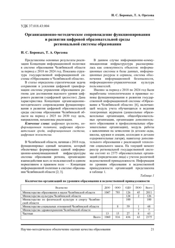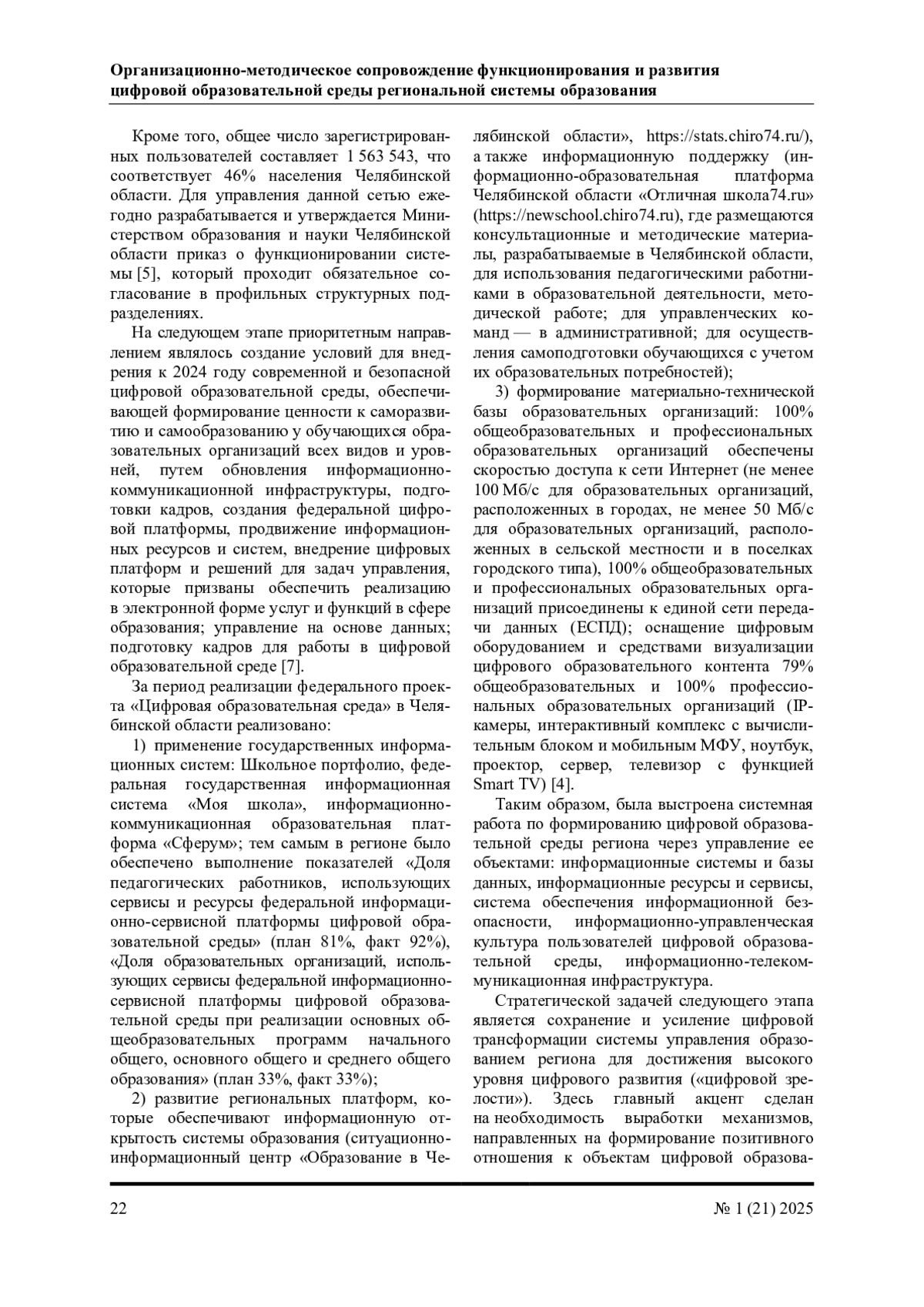 Представлены основные результаты реализации Концепции информационной политики в системе образования Челябинской области за период с 2018 по 2024 год. Показана структура государственной информационной системы «Образование в Челябинской области». В статье определена стратегическая задача сохранения и усиления цифровой трансформации системы управления образованием региона для достижения высокого уровня цифрового развития («цифровой зрелости»). Дана характеристика Концепции организационно-методического сопровождения функционирования и развития цифровой образовательной среды системы образования Челябинской области на период с 2025 по 2030 год: цель, направления, механизмы реализации.