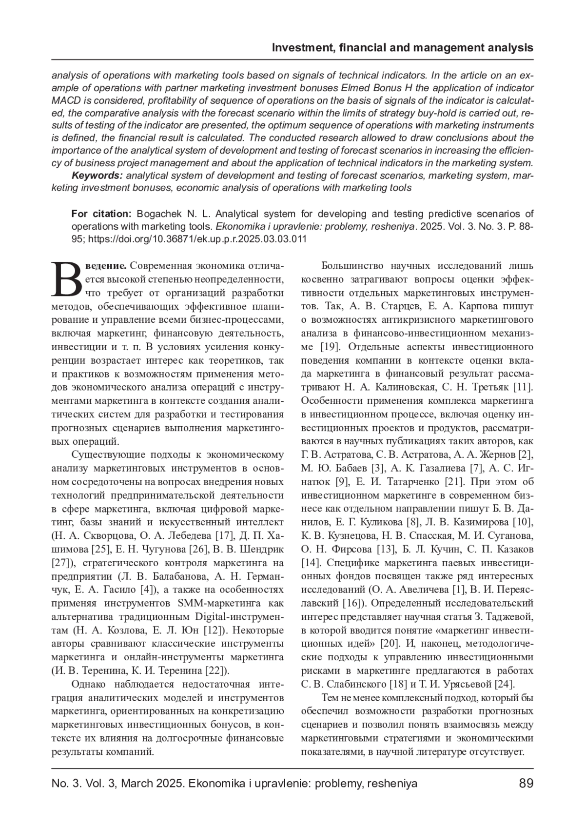 Статья посвящена разработке аналитической системы разработки и тестирования прогнозных сценариев операций с инструментами маркетинга, являющейся важнейшим компонентом цифровой информационной среды маркетинговой системы в управлении бизнес-проектами. Представленная система обеспечивает возможность проводить экономический анализ операций с маркетинговыми инструментами, осуществляемых на основе сигналов технических индикаторов. В статье на примере операций с партнерскими маркетинговыми инвестиционными бонусами Elmed Bonus H рассмотрено применение индикатора MACD, рассчитана доходность последовательности операций на основе сигналов индикатора и проведен сравнительный анализ с прогнозным сценарием в рамках стратегии «купи-держи». Представлены результаты тестирования индикатора, определена оптимальная последовательность операций с маркетинговыми инструментами, а также рассчитан финансовый результат. Проведенное исследование позволило сделать вывод о значении аналитической системы разработки и тестирования прогнозных сценариев для повышения эффективности менеджмента бизнес-проектов и о возможностях применения технических индикаторов в маркетинговой системе.