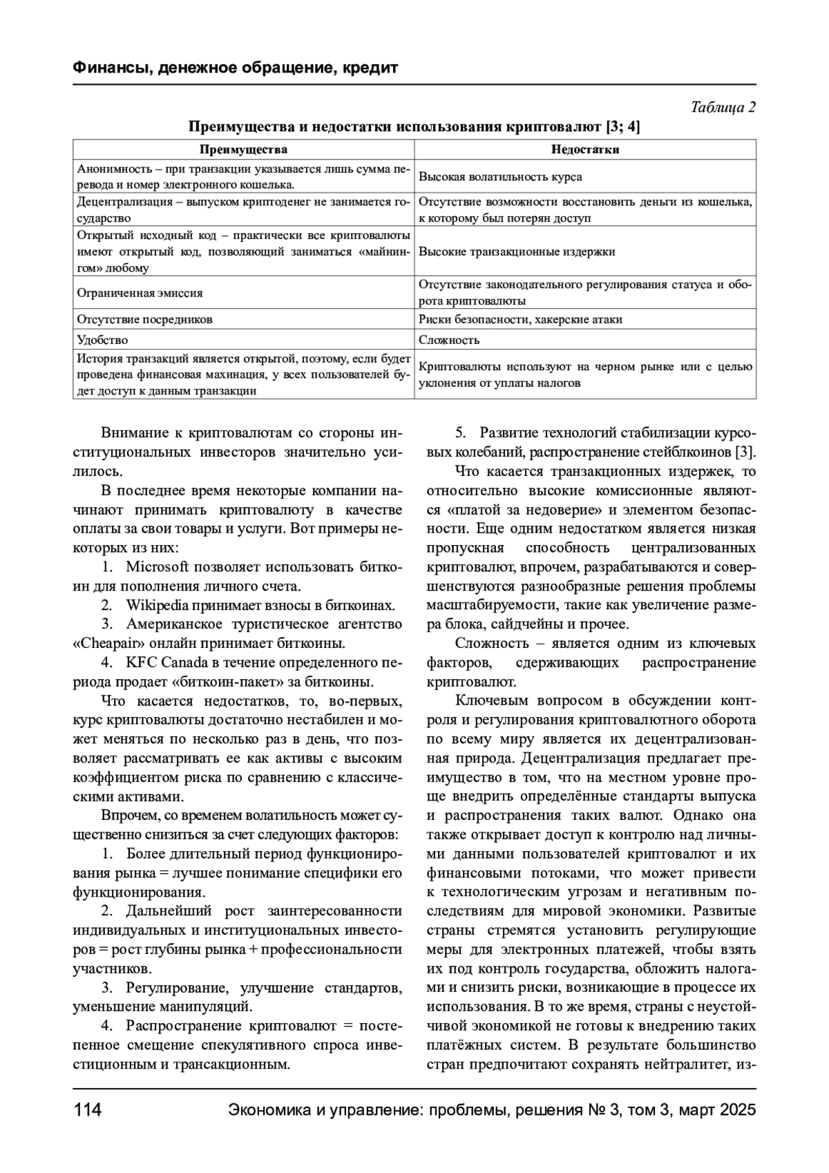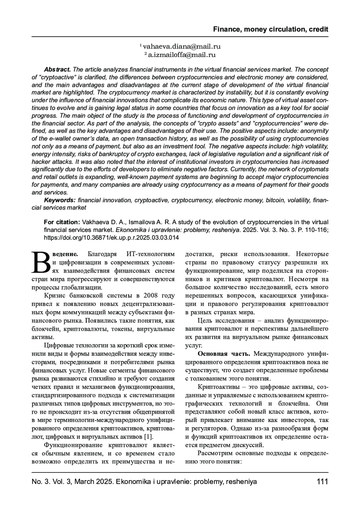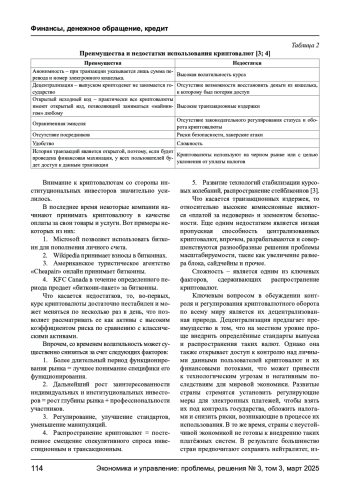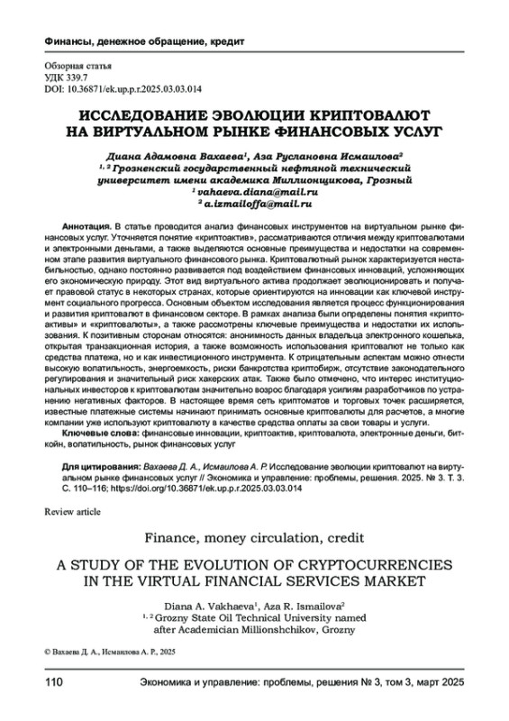 В статье проводится анализ финансовых инструментов на виртуальном рынке финансовых услуг. Уточняется понятие «криптоактив», рассматриваются отличия между криптовалютами и электронными деньгами, а также выделяются основные преимущества и недостатки на современном этапе развития виртуального финансового рынка. Криптовалютный рынок характеризуется нестабильностью, однако постоянно развивается под воздействием финансовых инноваций, усложняющих его экономическую природу. Этот вид виртуального актива продолжает эволюционировать и получает правовой статус в некоторых странах, которые ориентируются на инновации как ключевой инструмент социального прогресса. Основным объектом исследования является процесс функционирования и развития криптовалют в финансовом секторе. В рамках анализа были определены понятия «криптоактивы» и «криптовалюты», а также рассмотрены ключевые преимущества и недостатки их использования. К позитивным сторонам относятся: анонимность данных владельца электронного кошелька, открытая транзакционная история, а также возможность использования криптовалют не только как средства платежа, но и как инвестиционного инструмента. К отрицательным аспектам можно отнести высокую волатильность, энергоемкость, риски банкротства криптобирж, отсутствие законодательного регулирования и значительный риск хакерских атак. Также было отмечено, что интерес институциональных инвесторов к криптовалютам значительно возрос благодаря усилиям разработчиков по устранению негативных факторов. В настоящее время сеть криптоматов и торговых точек расширяется, известные платежные системы начинают принимать основные криптовалюты для расчетов, а многие компании уже используют криптовалюту в качестве средства оплаты за свои товары и услуги.