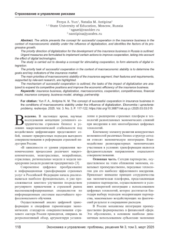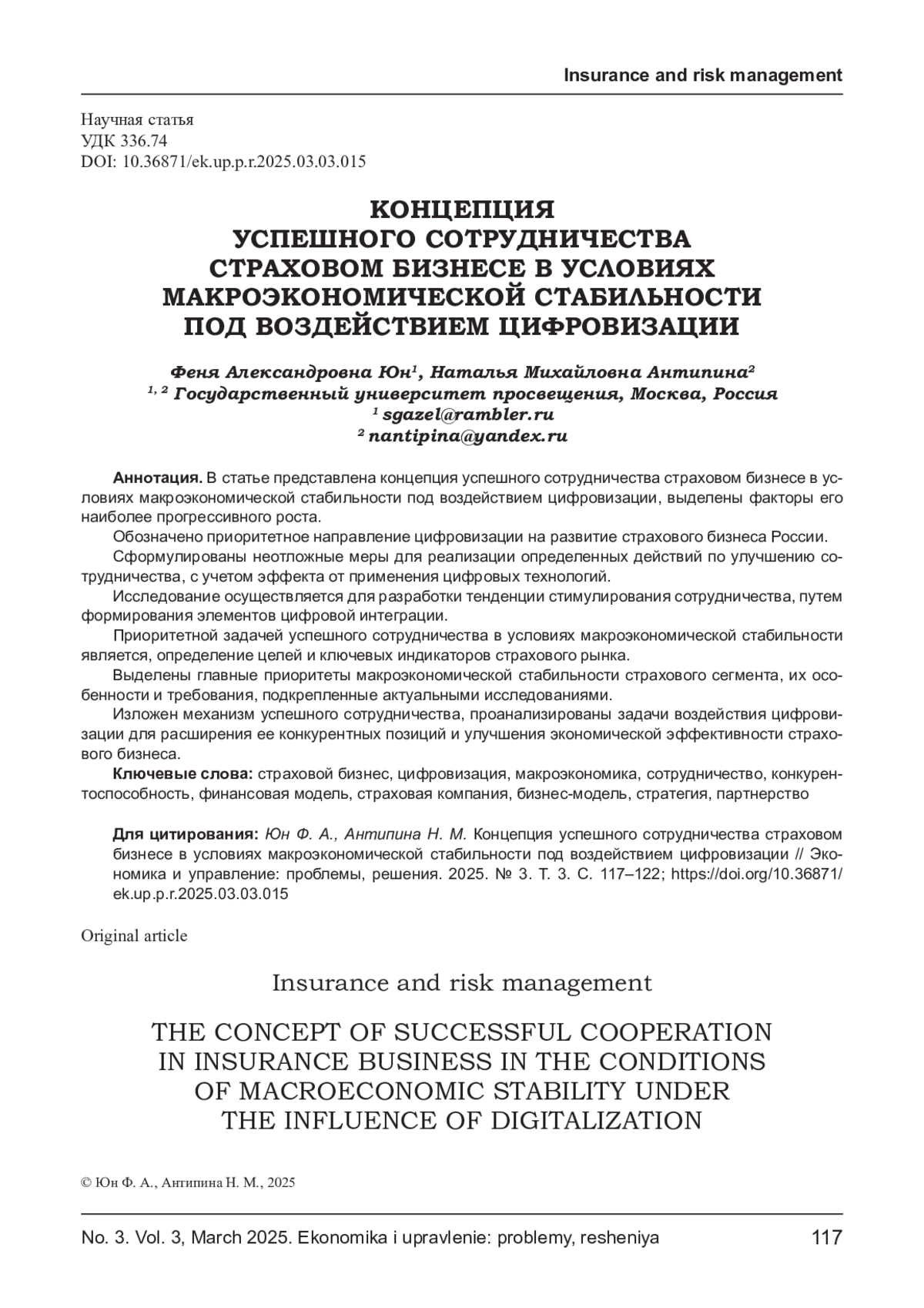 В статье представлена концепция успешного сотрудничества страховом бизнесе в условиях макроэкономической стабильности под воздействием цифровизации, выделены факторы его наиболее прогрессивного роста. Обозначено приоритетное направление цифровизации на развитие страхового бизнеса России. Сформулированы неотложные меры для реализации определенных действий по улучшению сотрудничества, с учетом эффекта от применения цифровых технологий. Исследование осуществляется для разработки тенденции стимулирования сотрудничества, путем формирования элементов цифровой интеграции. Приоритетной задачей успешного сотрудничества в условиях макроэкономической стабильности является, определение целей и ключевых индикаторов страхового рынка. Выделены главные приоритеты макроэкономической стабильности страхового сегмента, их особенности и требования, подкрепленные актуальными исследованиями. Изложен механизм успешного сотрудничества, проанализированы задачи воздействия цифровизации для расширения ее конкурентных позиций и улучшения экономической эффективности страхового бизнеса.