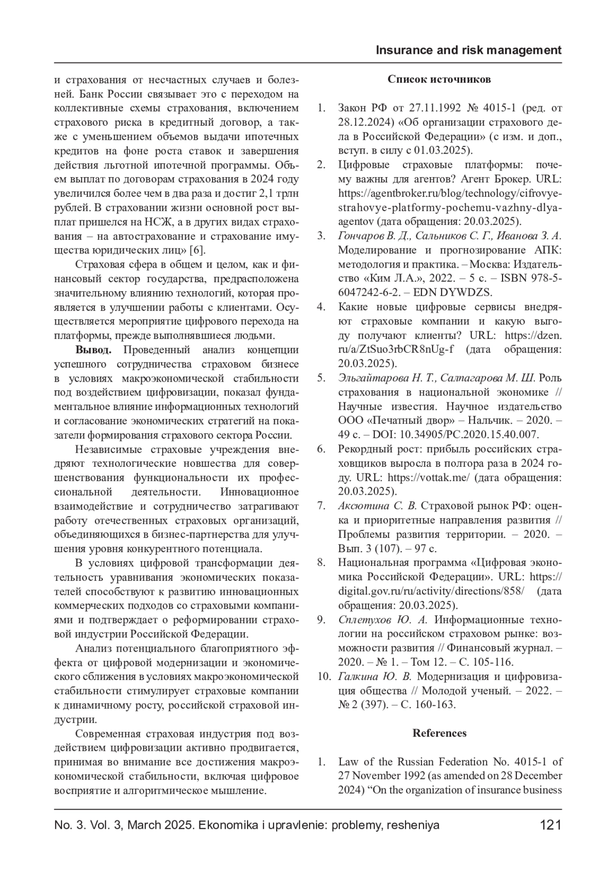 5. Эльгайтарова Н. Т., Салпагарова М. Ш. Роль страхования в национальной экономике // Научные известия. Научное издательство ООО “Печатный двор” - Нальчик. - 2020. - 49 с. -. DOI: 10.34905/PC.2020.15.40.007