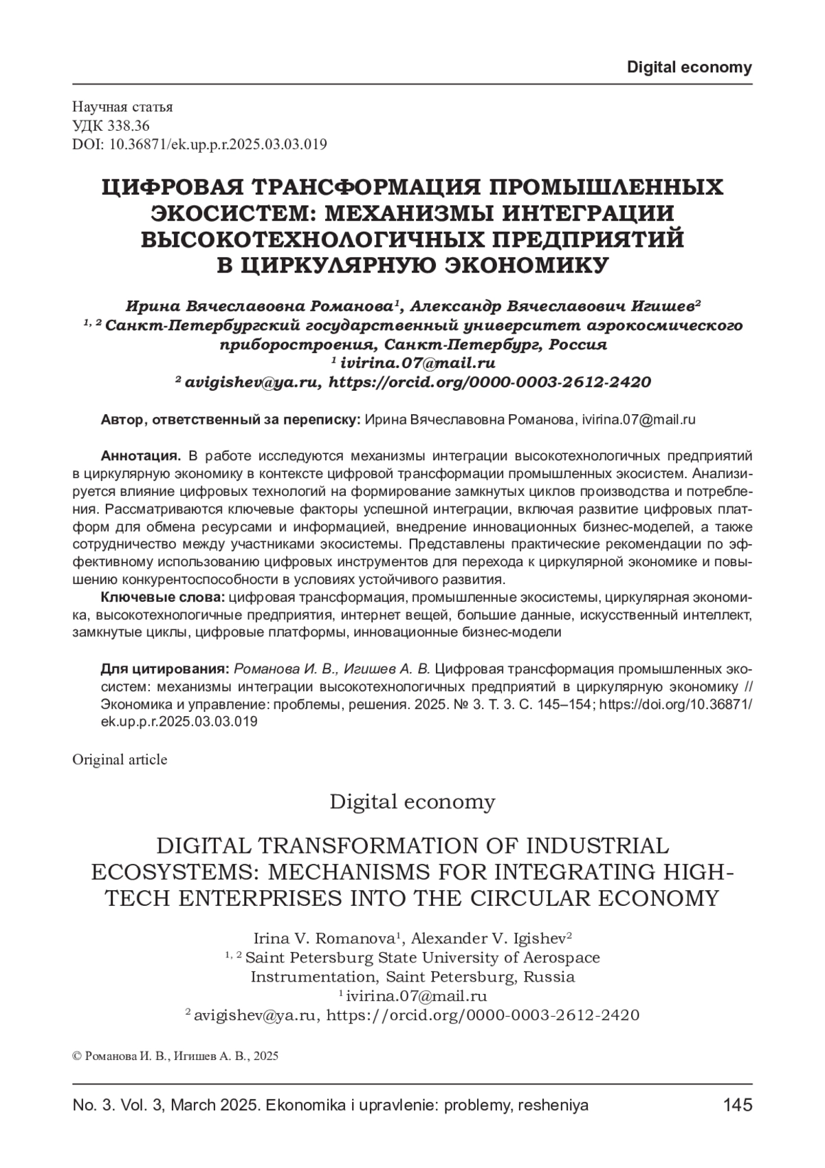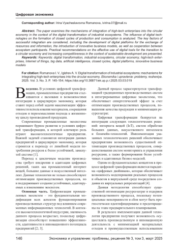 В работе исследуются механизмы интеграции высокотехнологичных предприятий в циркулярную экономику в контексте цифровой трансформации промышленных экосистем. Анализируется влияние цифровых технологий на формирование замкнутых циклов производства и потребления. Рассматриваются ключевые факторы успешной интеграции, включая развитие цифровых платформ для обмена ресурсами и информацией, внедрение инновационных бизнес-моделей, а также сотрудничество между участниками экосистемы. Представлены практические рекомендации по эффективному использованию цифровых инструментов для перехода к циркулярной экономике и повышению конкурентоспособности в условиях устойчивого развития.