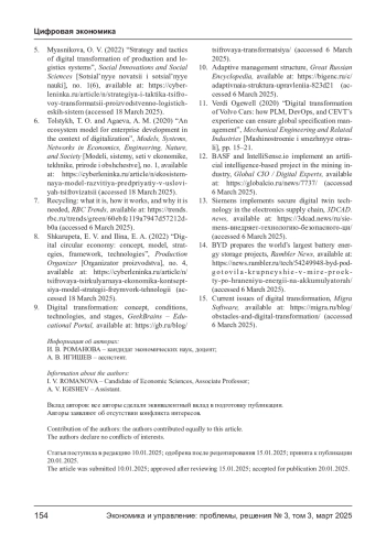 5. Мясникова О. В. Стратегия и тактика цифровой трансформации производственно-логистических систем [Электронный ресурс] // Социальные новации и социальные науки. 2022. №1 (6). URL: https://cyberleninka.ru/article/n/strategiya-i-taktika-tsifrovoy-transformatsii-proizvodstvenno-logisticheskih-sistem (дата обращения: 18.03.2025). EDN: PAFQJA