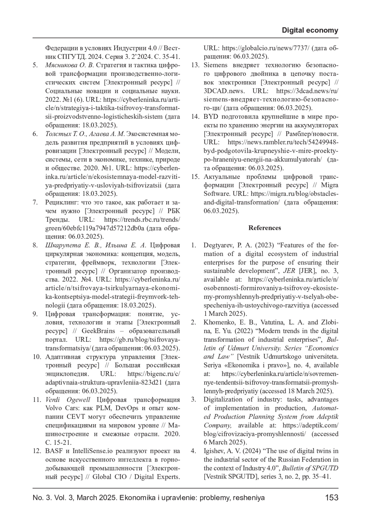 1. Дегтярев П. А. Особенности формирования цифровой экосистемы промышленных предприятий в целях обеспечения их устойчивого развития [Электронный ресурс] // JER. 2023. № 3. URL: https://cyberleninka.ru/article/n/osobennosti-formirovaniya-tsifrovoy-ekosistemy-promyshlennyh-predpriyatiy-v-tselyah-obespecheniya-ih-ustoychivogo-razvitiya (дата обращения: 01.03.2025).