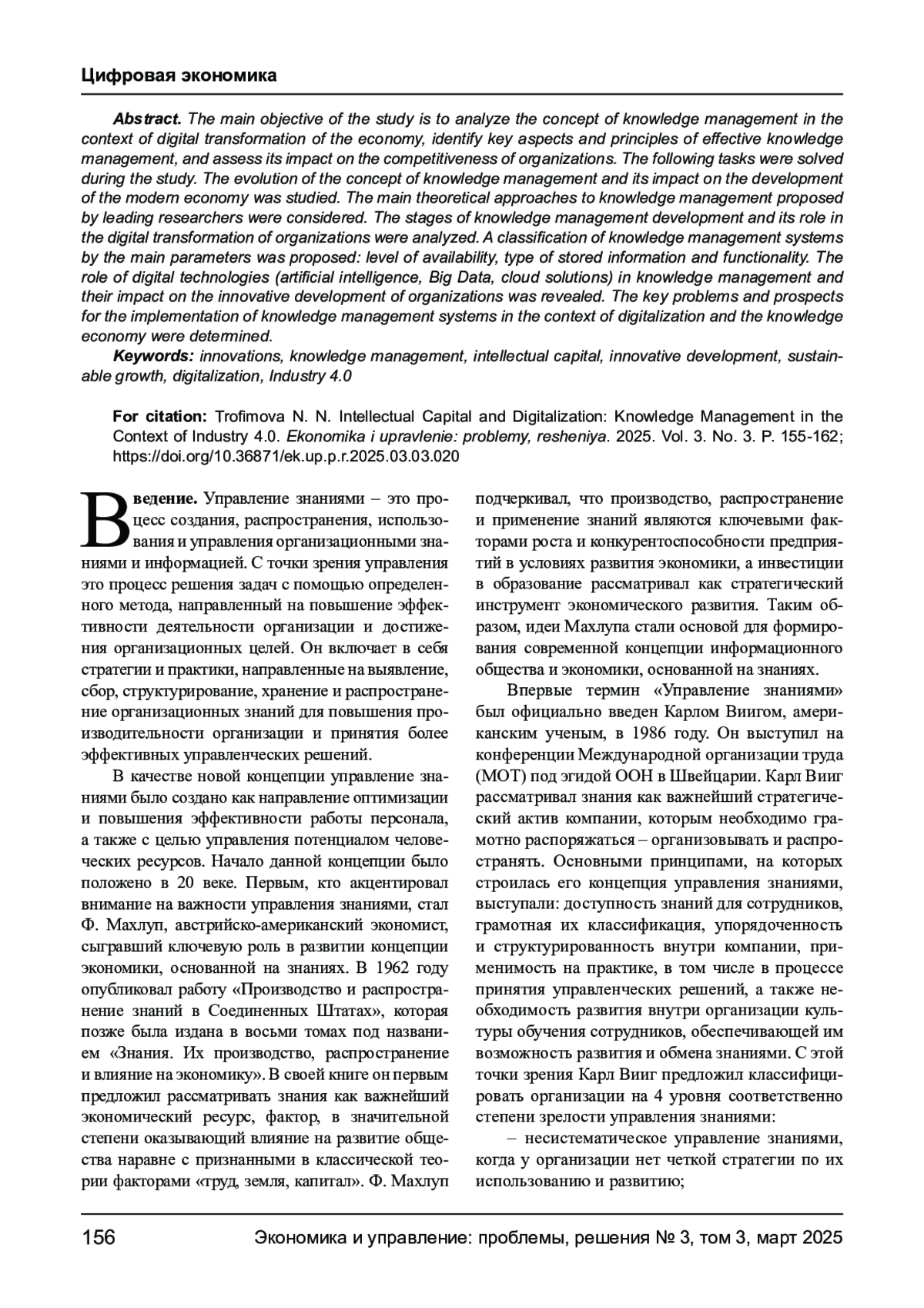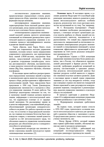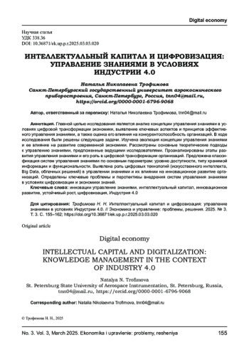 Главной целью исследования является анализ концепции управления знаниями в условиях цифровой трансформации экономики, выявление ключевых аспектов и принципов эффективного управления знаниями, а также оценка его влияния на конкурентоспособность организаций. В ходе исследования были решены следующие задачи. Изучена эволюция концепции управления знаниями и ее влияние на развитие современной экономики. Рассмотрены основные теоретические подходы к управлению знаниями, предложенные ведущими исследователями. Проанализированы этапы развития управления знаниями и его роль в цифровой трансформации организаций. Предложена классификация систем управления знаниями по основным параметрам: уровню доступности, типу хранимой информации и функциональности. Выявлена роль цифровых технологий (искусственного интеллекта, Big Data, облачных решений) в управлении знаниями и их влиянии на инновационное развитие организаций. Определены ключевые проблемы и перспективы внедрения систем управления знаниями в условиях цифровизации и экономики знаний.