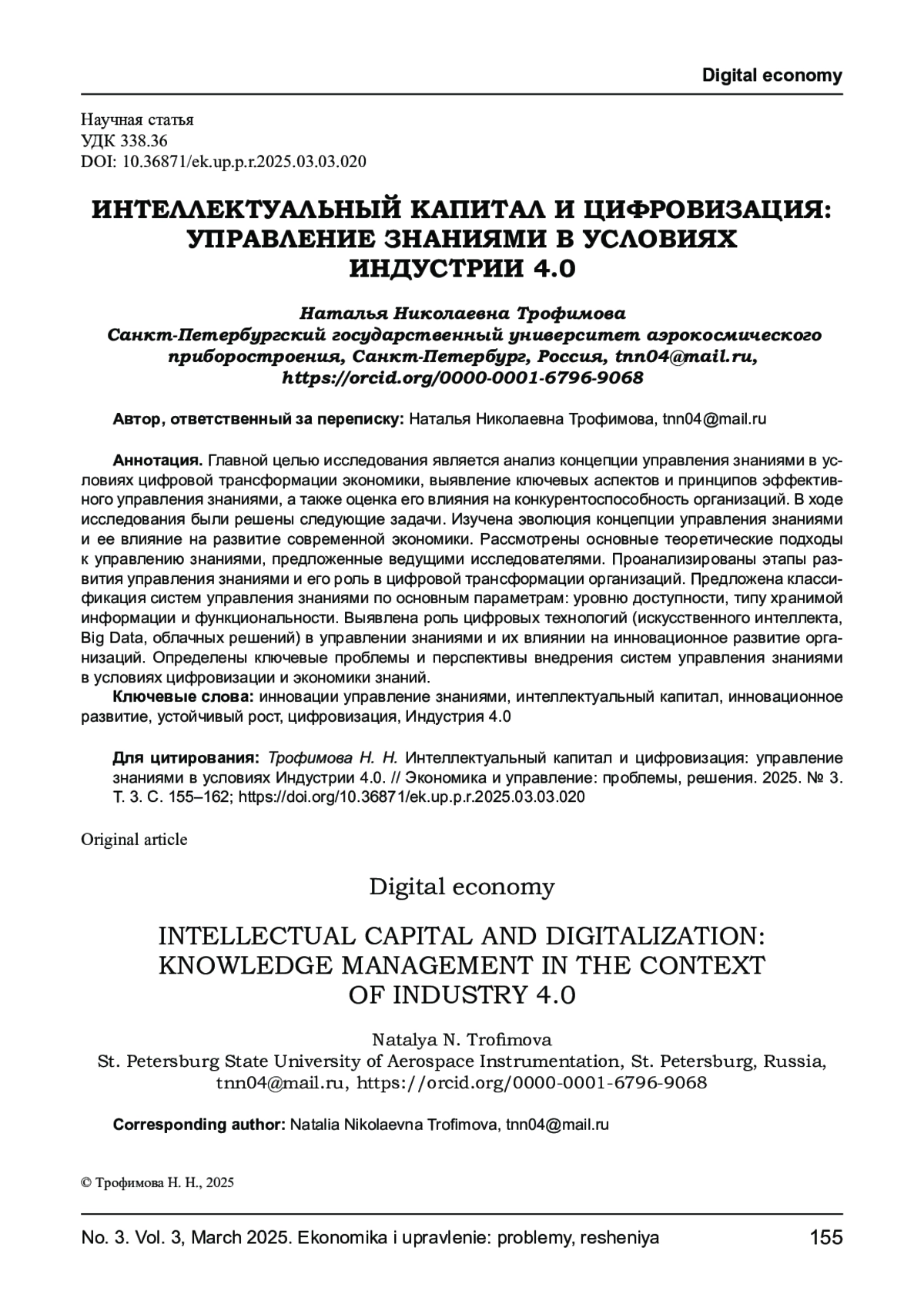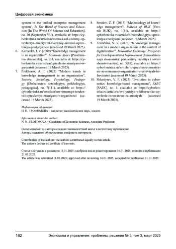 9. Терехина С. В. Управление знаниями современной организации в условиях цифровизации // Инновационная экономика: перспективы развития и совершенствования. - 2023. - № 3 (69). URL: https://cyberleninka.ru/article/n/upravlenie-znaniyami-sovremennoyorganizatsii-v-usloviyah-tsifrovizatsii (дата обращения: 19.03.2025). EDN: ANEXXU