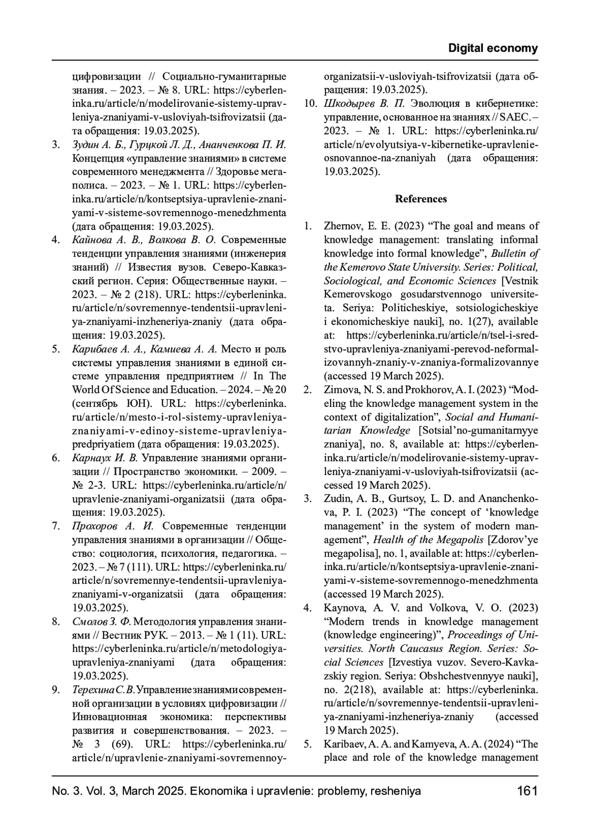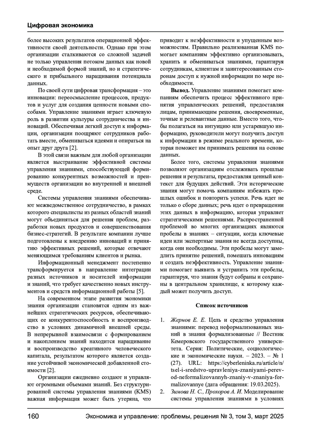 1. Жернов Е. Е. Цель и средство управления знаниями: перевод неформализованных знаний в знания формализованные // Вестник Кемеровского государственного университета. Серия: Политические, социологические и экономические науки. - 2023. - № 1 (27). URL: https://cyberleninka.ru/article/n/tsel-i-sredstvo-upravleniya-znaniyami-perevod-neformalizovannyh-znaniy-v-znaniya-formalizovannye (дата обращения: 19.03.2025). EDN: YEXULU