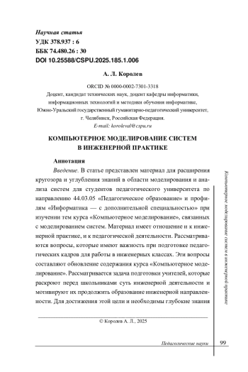 Введение. В статье представлен материал для расширения кругозора и углубления знаний в области моделирования и анализа систем для студентов педагогического университета по направлению 44.03.05 «Педагогическое образование» и профилям «Информатика - с дополнительной специальностью» при изучении тем курса «Компьютерное моделирование», связанных с моделированием систем. Материал имеет отношение и к инженерной практике, и к педагогической деятельности. Рассматриваются вопросы, которые имеют важность при подготовке педагогических кадров для работы в инженерных классах. Эти вопросы составляют обновление содержания курса «Компьютерное моделирование». Рассматривается задача подготовки учителей, которые раскроют перед школьниками суть инженерной деятельности и мотивируют их продолжить образование инженерной направленности. Для достижения этой цели и необходимы глубокие знания предмета и широкий кругозор. При подготовке педагогов следует опираться на основные принципы русской инженерной школы, которые прошли проверку временем и показали отличные результаты: получение фундаментальных знаний в области точных и естественных наук, тесная связь образования и применения этих знаний.