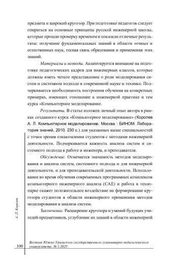 Материалы и методы. Акцентируется внимание на подготовке педагогических кадров для инженерных классов, которые должны иметь четкое представление о роли моделирования систем и системном подходе в современной науке и технике. Подчеркивается необходимость построения обучения на конкретных примерах, имеющих отношение к инженерной практике и тем курса «Компьютерное моделирование.