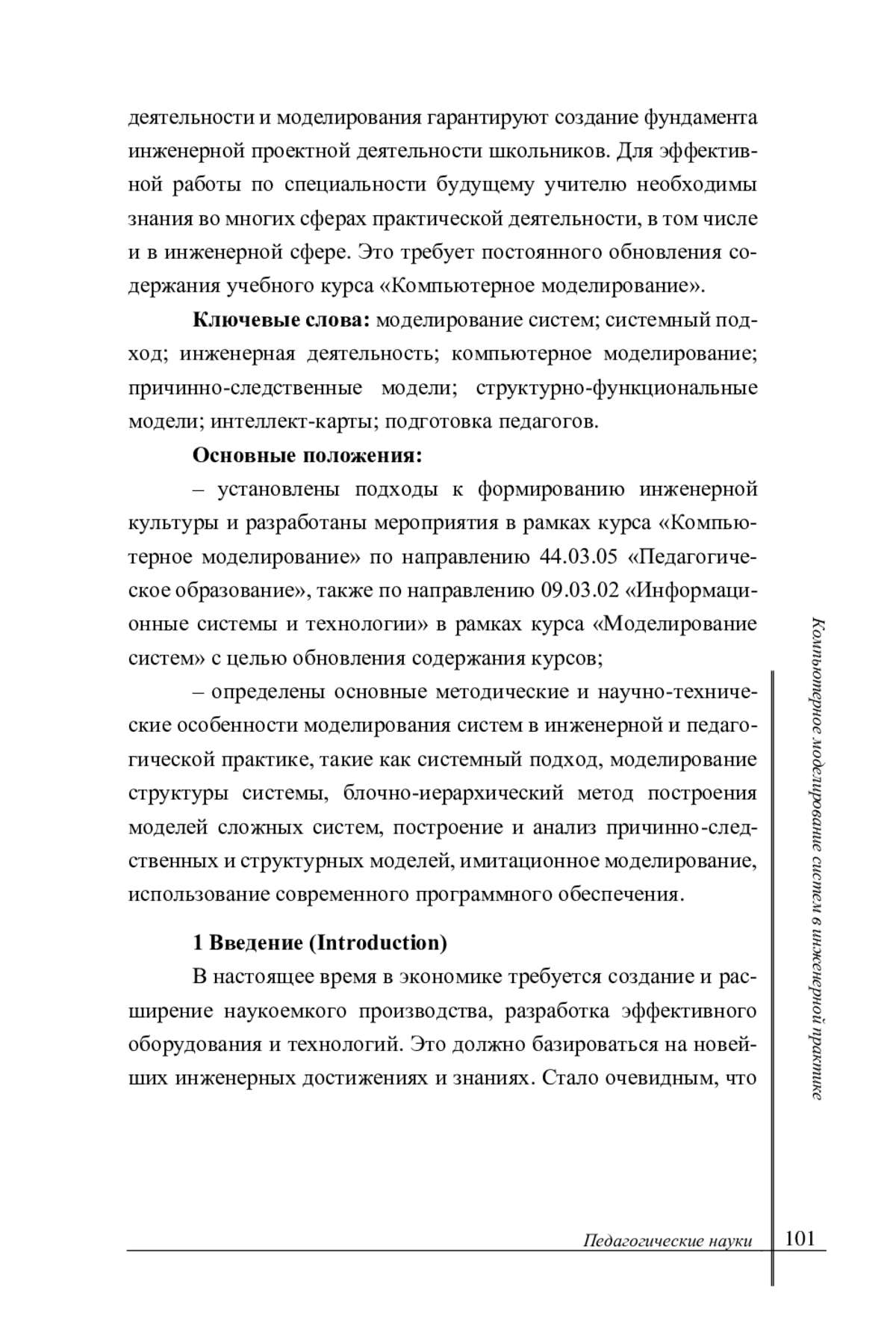 Заключение. Расширение кругозора и умений будущих учителей-предметников, углубление их знаний в области инженерной деятельности и моделирования гарантируют создание фундамента инженерной проектной деятельности школьников. Для эффективной работы по специальности будущему учителю необходимы знания во многих сферах практической деятельности, в том числе и в инженерной сфере. Это требует постоянного обновления содержания учебного курса «Компьютерное моделирование». Основные положения: - установлены подходы к формированию инженерной культуры и разработаны мероприятия в рамках курса «Компьютерное моделирование» по направлению 44.03.05 «Педагогическое образование», также по направлению 09.03.02 «Информационные системы и технологии» в рамках курса «Моделирование систем» с целью обновления содержания курсов; - определены основные методические и научно-технические особенности моделирования систем в инженерной и педагогической практике, такие как системный подход, моделирование структуры системы, блочно-иерархический метод построения моделей сложных систем, построение и анализ причинно-следственных и структурных моделей, имитационное моделирование, использование современного программного обеспечения.