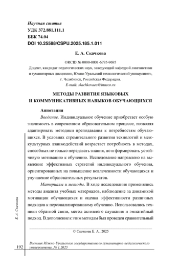 Введение. Индивидуальное обучение приобретает особую значимость в современном образовательном процессе, позволяя адаптировать методики преподавания к потребностям обучающихся. В условиях стремительного развития технологий и межкультурных взаимодействий возрастает потребность в методах, способных не только передавать знания, но и формировать устойчивую мотивацию к обучению. Исследование направлено на выявление эффективных стратегий индивидуального обучения, ориентированных на повышение вовлеченности обучающихся и улучшение образовательных результатов.