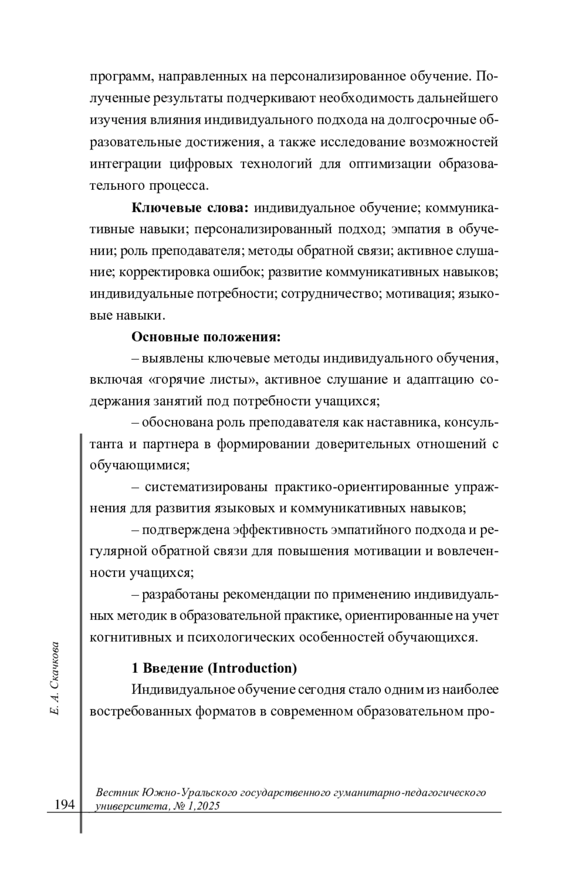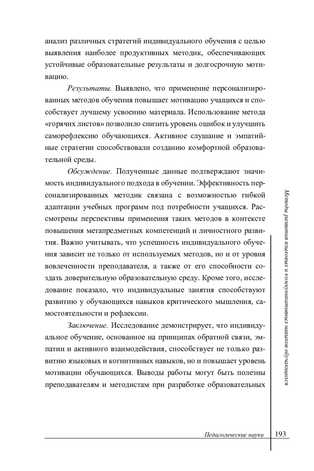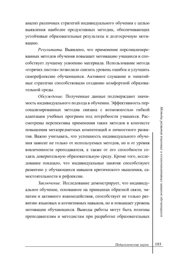 Заключение. Исследование демонстрирует, что индивидуальное обучение, основанное на принципах обратной связи, эмпатии и активного взаимодействия, способствует не только развитию языковых и когнитивных навыков, но и повышает уровень мотивации обучающихся. Выводы работы могут быть полезны преподавателям и методистам при разработке образовательных программ, направленных на персонализированное обучение. Полученные результаты подчеркивают необходимость дальнейшего изучения влияния индивидуального подхода на долгосрочные образовательные достижения, а также исследование возможностей интеграции цифровых технологий для оптимизации образовательного процесса. Основные положения: - выявлены ключевые методы индивидуального обучения, включая «горячие листы», активное слушание и адаптацию содержания занятий под потребности учащихся; - обоснована роль преподавателя как наставника, консультанта и партнера в формировании доверительных отношений с обучающимися; - систематизированы практико-ориентированные упражнения для развития языковых и коммуникативных навыков; - подтверждена эффективность эмпатийного подхода и регулярной обратной связи для повышения мотивации и вовлеченности учащихся; - разработаны рекомендации по применению индивидуальных методик в образовательной практике, ориентированные на учет когнитивных и психологических особенностей обучающихся.