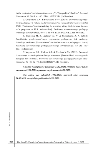 5. Горюнова Л. В., Полякова Е. В. Особенности подготовки педагогов к работе с одаренными детьми в магистратуре университетах США // Проблемы современного педагогического образования. 2020. № 69-4. С. 63-66. EDN: FOZMYX