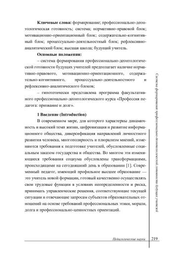 Введение. На сегодняшний день изменяются требования к высшему педагогическому образованию, что обусловлено социальным заказом государства и социума, стремительно изменяющимися условиями жизни и деятельности. Одним из требований к современному учителю является наличие способности и готовности действовать и принимать решения на основе профессиональных этики, морали, долга и ценностных ориентаций. Данное требование обусловливает необходимость разработки такой системы формирования профессионально-деонтологической готовности педагогов, которая будет способствовать их успешной деятельности в условиях современного профессионально-педагогического ландшафта и изменений, происходящих в обществе и системе образования.