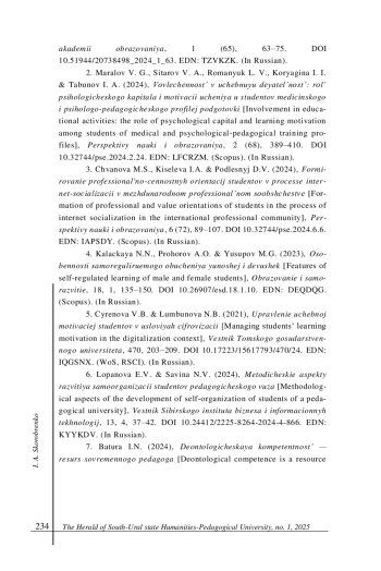 6. Лопанова Е. В., Савина Н. В. Методические аспекты развития самоорганизации студентов педагогического вуза // Вестник Сибирского института бизнеса и информационных технологий. 2024. Т. 13, № 4. С. 37-42. DOI: 10.24412/2225-8264-2024-4-866 EDN: KYYKDV