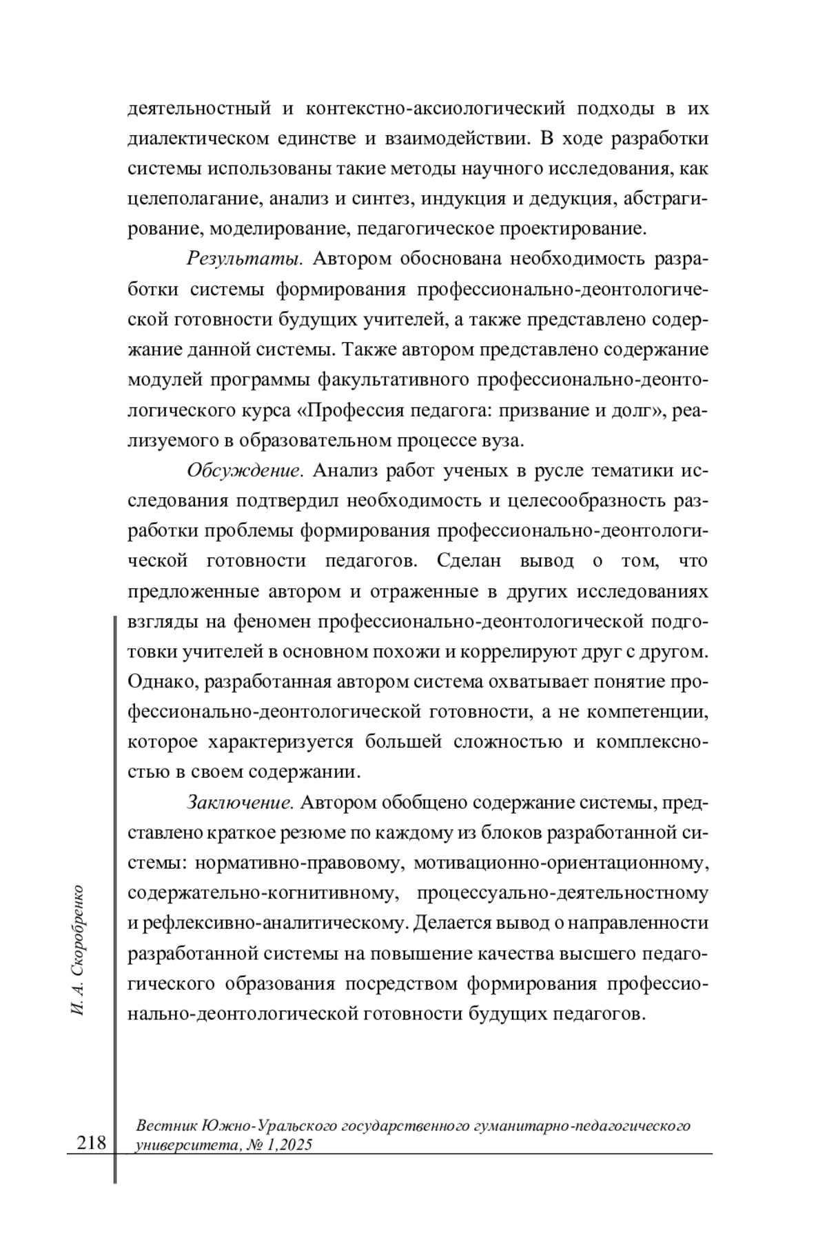 Результаты. Автором обоснована необходимость разработки системы формирования профессионально-деонтологической готовности будущих учителей, а также представлено содержание данной системы. Также автором представлено содержание модулей программы факультативного профессионально-деонтологического курса «Профессия педагога: призвание и долг», реализуемого в образовательном процессе вуза.