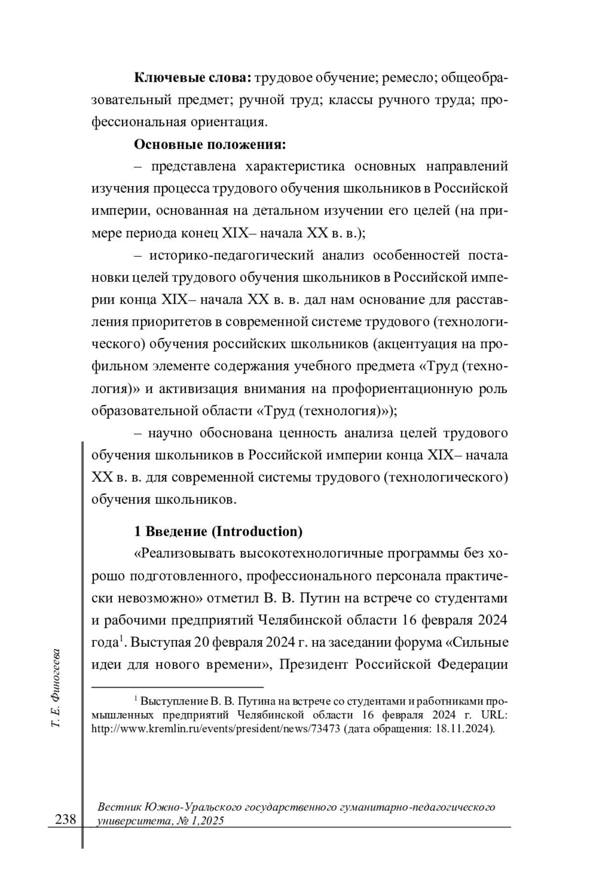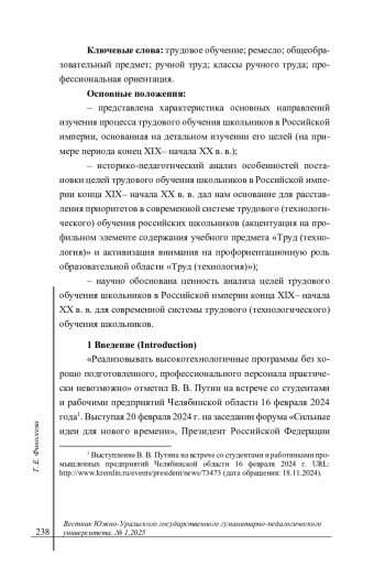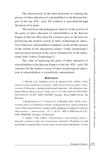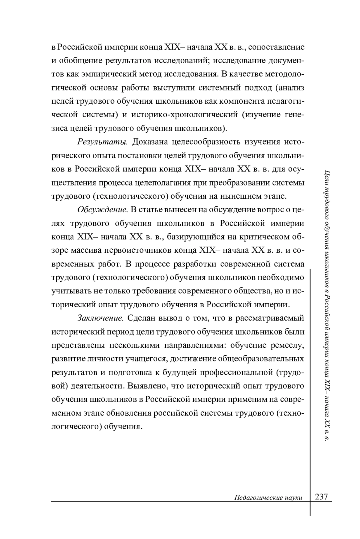 Заключение. Сделан вывод о том, что в рассматриваемый исторический период цели трудового обучения школьников были представлены несколькими направлениями: обучение ремеслу, развитие личности учащегося, достижение общеобразовательных результатов и подготовка к будущей профессиональной (трудовой) деятельности. Выявлено, что исторический опыт трудового обучения школьников в Российской империи применим на современном этапе обновления российской системы трудового (технологического) обучения. Основные положения: - представлена характеристика основных направлений изучения процесса трудового обучения школьников в Российской империи, основанная на детальном изучении его целей (на примере периода конец XIX- начала ХХ в. в.); - историко-педагогический анализ особенностей постановки целей трудового обучения школьников в Российской империи конца XIX- начала ХХ в. в. дал нам основание для расставления приоритетов в современной системе трудового (технологического) обучения российских школьников (акцентуация на профильном элементе содержания учебного предмета «Труд (технология)» и активизация внимания на профориентационную роль образовательной области «Труд (технология)»); - научно обоснована ценность анализа целей трудового обучения школьников в Российской империи конца XIX- начала ХХ в. в. для современной системы трудового (технологического) обучения школьников.