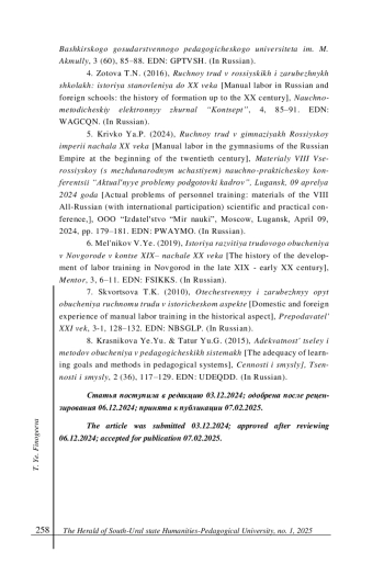 7. Скворцова Т. К. Отечественный и зарубежный опыт обучения ручному труду в историческом аспекте // Преподаватель XXI век. 2010. № 3-1. С. 128-132. EDN: NBSGLP