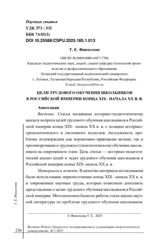 Введение. Статья посвящена историко-педагогическому анализу вопроса целей трудового обучения школьников в Российской империи конца XIX- начала ХХ в. в. с позиции историко-хронологического и системного подходов. Актуальность проблемы подтверждена как нормативно-правовыми актами, так и противоречиями в трудовом (технологическом) обучении школьников на современном этапе. Цель статьи - историко-педагогический анализ целей и задач трудового обучения школьников в Российской империи конца XIX-начала ХХ в. в.