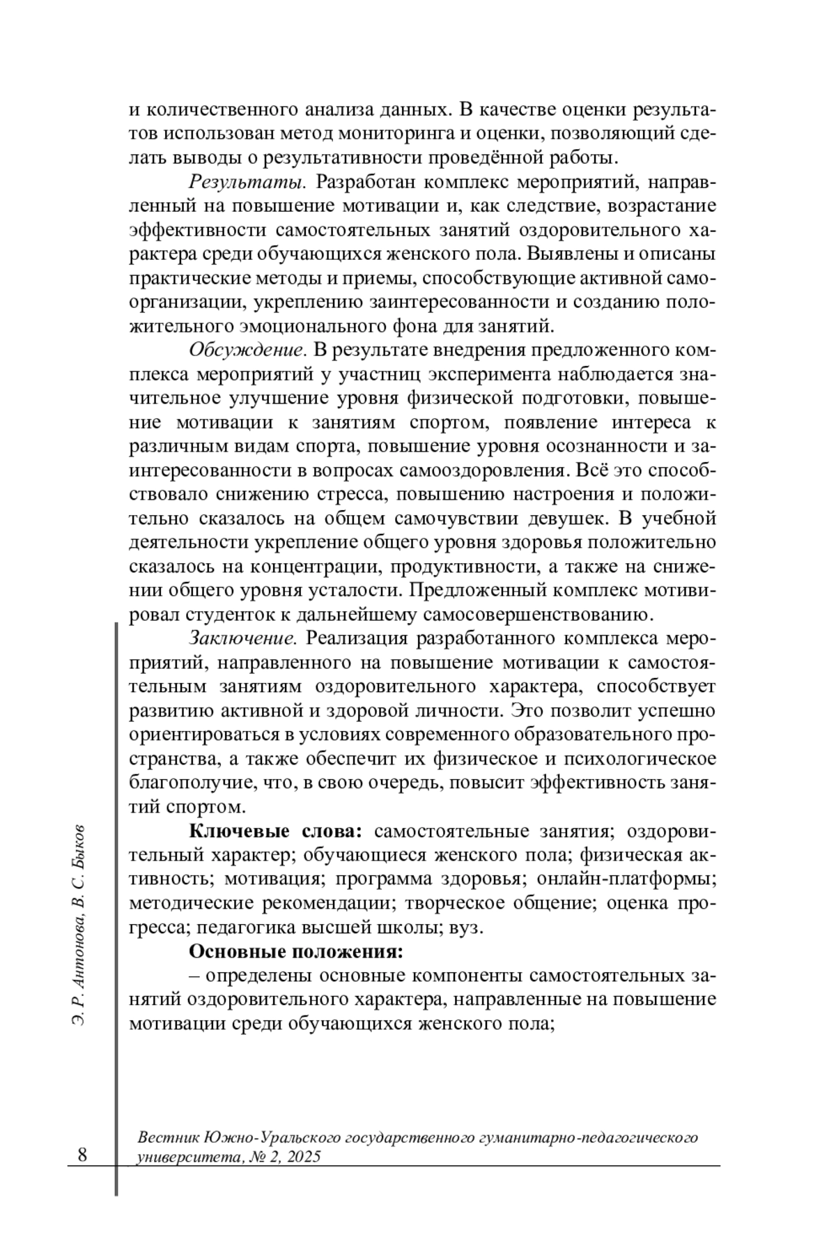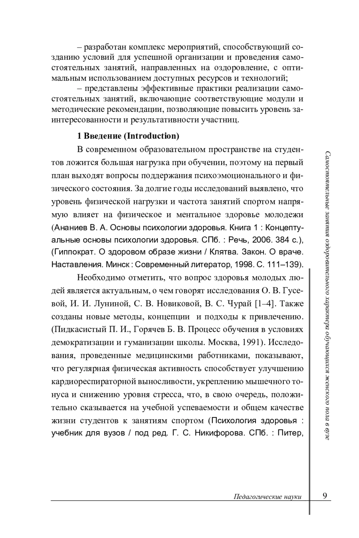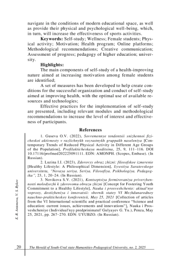 Заключение. Реализация разработанного комплекса мероприятий, направленного на повышение мотивации к самостоятельным занятиям оздоровительного характера, способствует развитию активной и здоровой личности. Это позволит успешно ориентироваться в условиях современного образовательного пространства, а также обеспечит их физическое и психологическое благополучие, что, в свою очередь, повысит эффективность занятий спортом. Основные положения: - определены основные компоненты самостоятельных занятий оздоровительного характера, направленные на повышение мотивации среди обучающихся женского пола; - разработан комплекс мероприятий, способствующий созданию условий для успешной организации и проведения самостоятельных занятий, направленных на оздоровление, с оптимальным использованием доступных ресурсов и технологий; - представлены эффективные практики реализации самостоятельных занятий, включающие соответствующие модули и методические рекомендации, позволяющие повысить уровень заинтересованности и результативности участниц.