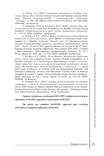 4. Чурай В. С. Отношение молодёжи к проблеме здорового образа жизни / Телескоп: журнал социологических и маркетинговых исследований. 2023. № 4. С. 105-108. DOI: 10.24412/1994-3776-2023-4-105-108 EDN: ZWZFMC