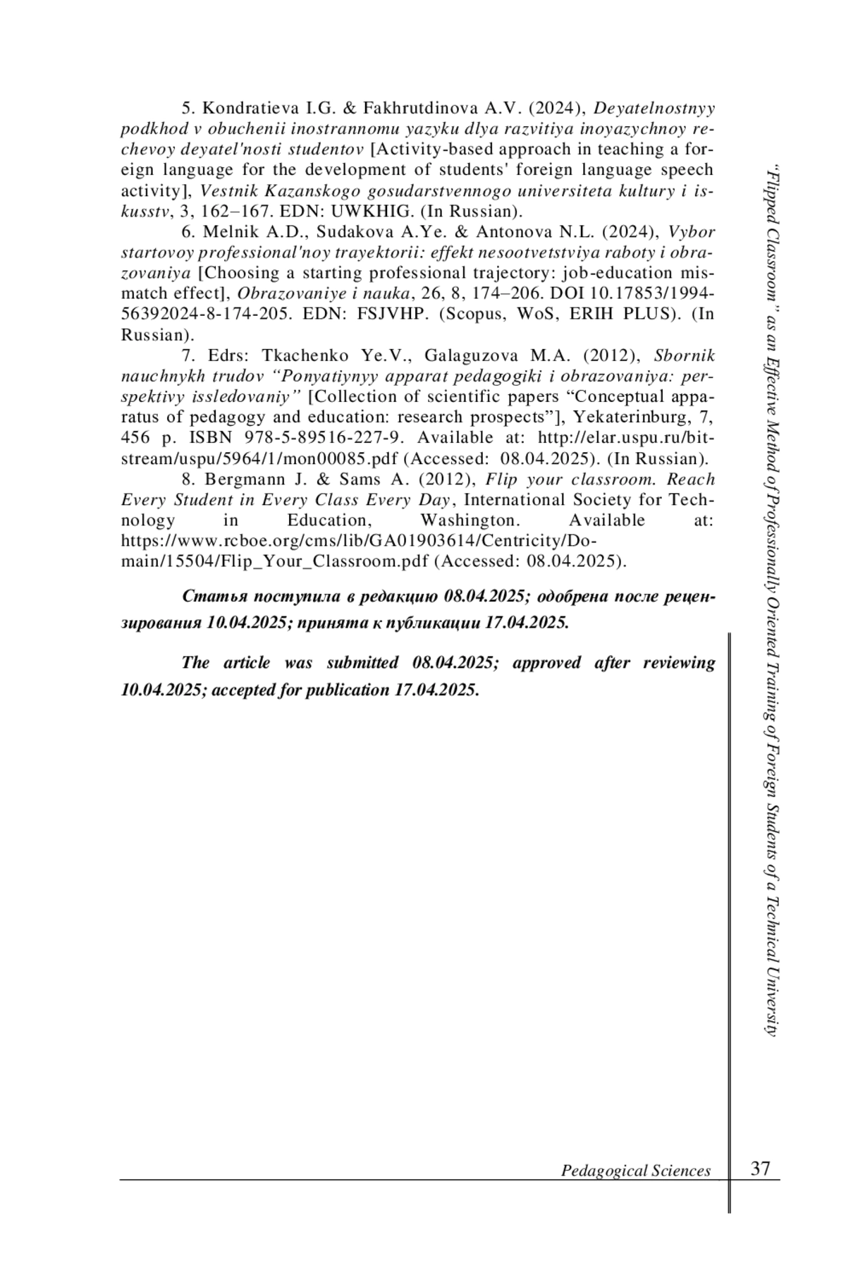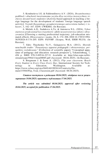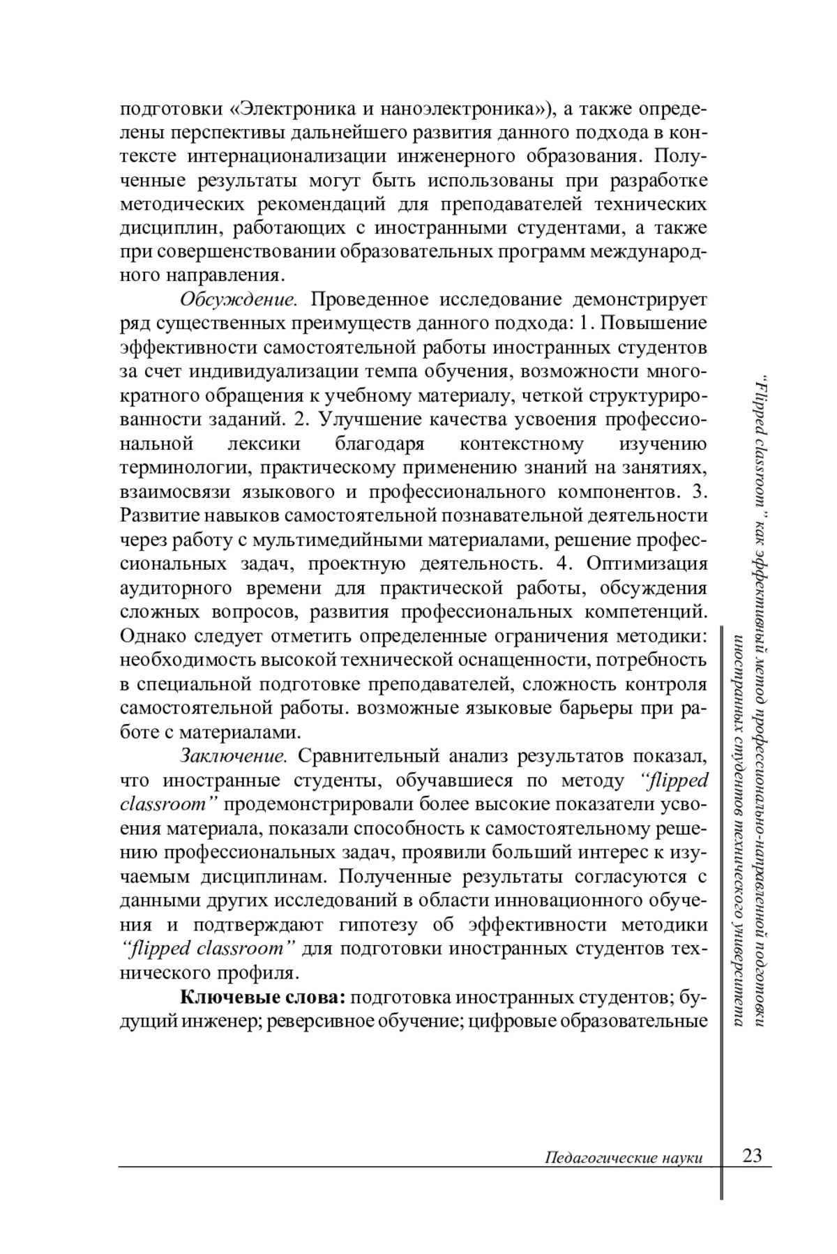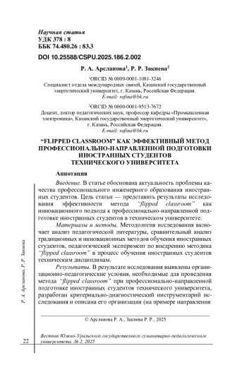 Введение. В статье обоснована актуальность проблемы качества профессионального инженерного образования иностранных студентов. Цель статьи - представить результаты исследования эффективности метода “flipped classroom” как инновационного подхода к профессионально-направленной подготовке иностранных студентов в техническом университете.