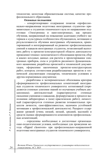 Заключение. Сравнительный анализ результатов показал, что иностранные студенты, обучавшиеся по методу “flipped classroom” продемонстрировали более высокие показатели усвоения материала, показали способность к самостоятельному решению профессиональных задач, проявили больший интерес к изучаемым дисциплинам. Полученные результаты согласуются с данными других исследований в области инновационного обучения и подтверждают гипотезу об эффективности методики “flipped classroom” для подготовки иностранных студентов технического профиля. Основные положения: - конкретизировано содержание понятия «профессионально-направленная подготовка иностранных студентов» применительно к студентам технического вуза по направлению подготовки «Электроника и наноэлектроника», как процесс обучения, направленный на повышение адаптации учебного материала к культурным особенностям обучающихся, мотивации и результативности обучения иностранных обучающихся, ориентированный и интегрированный на развитие профессиональных умений и навыков иностранных студентов, позволяющий выполнять работу в проектно-конструкторской области деятельности: проведение технико-экономического обоснования проектов; сбор и анализ исходных данных для расчета и проектирования электронных приборов, схем и устройств различного функционального назначения; разработка проектной и технической документации, оформление законченных проектно-конструкторских работ; контроль соответствия разрабатываемых проектов и технической документации стандартам, техническим условиям и другим нормативным документам; - разработаны и экспериментально обоснованы критерии сформированности профессиональных компетенций иностранных студентов технического университета: когнитивный (определяется степенью усвоения знаний по изучаемым учебным дисциплинам); деятельностный (характеризуется степенью овладения умениями и навыками, формируемыми в процессе выполнения лабораторных и (или) практических работ); личностный (характеризуется степенью развития познавательных процессов личности, самоэффективностью, наличием устойчивой мотивации к профессиональной деятельности). Раскрыто содержание уровней (очень низкий, низкий, средний, высокий) и средств оценки сформированности компонентов профессиональных компетенций; - определены необходимые и достаточные организационно-педагогические условия, необходимые для проведения метода «flipped classroom» при профессионально-направленной подготовке иностранных студентов технического университета.