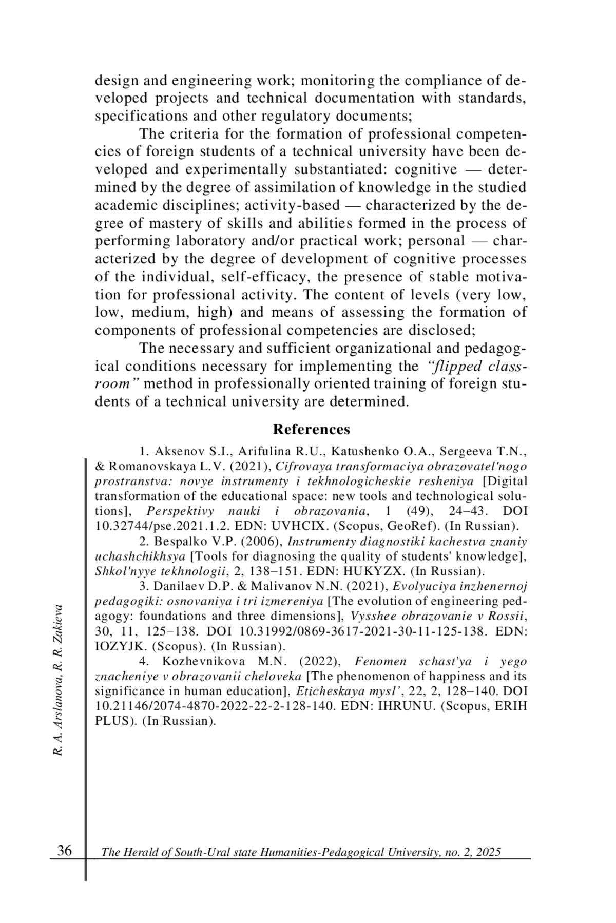 Результаты. В результате исследования выявлены организационно-педагогические условия, необходимые для проведения метода “flipped classroom” при профессионально-направленной подготовке иностранных студентов технического университета, разработан критериально-диагностический инструментарий исследования и описана его организация (на примере направления подготовки «Электроника и наноэлектроника»), а также определены перспективы дальнейшего развития данного подхода в контексте интернационализации инженерного образования. Полученные результаты могут быть использованы при разработке методических рекомендаций для преподавателей технических дисциплин, работающих с иностранными студентами, а также при совершенствовании образовательных программ международного направления.