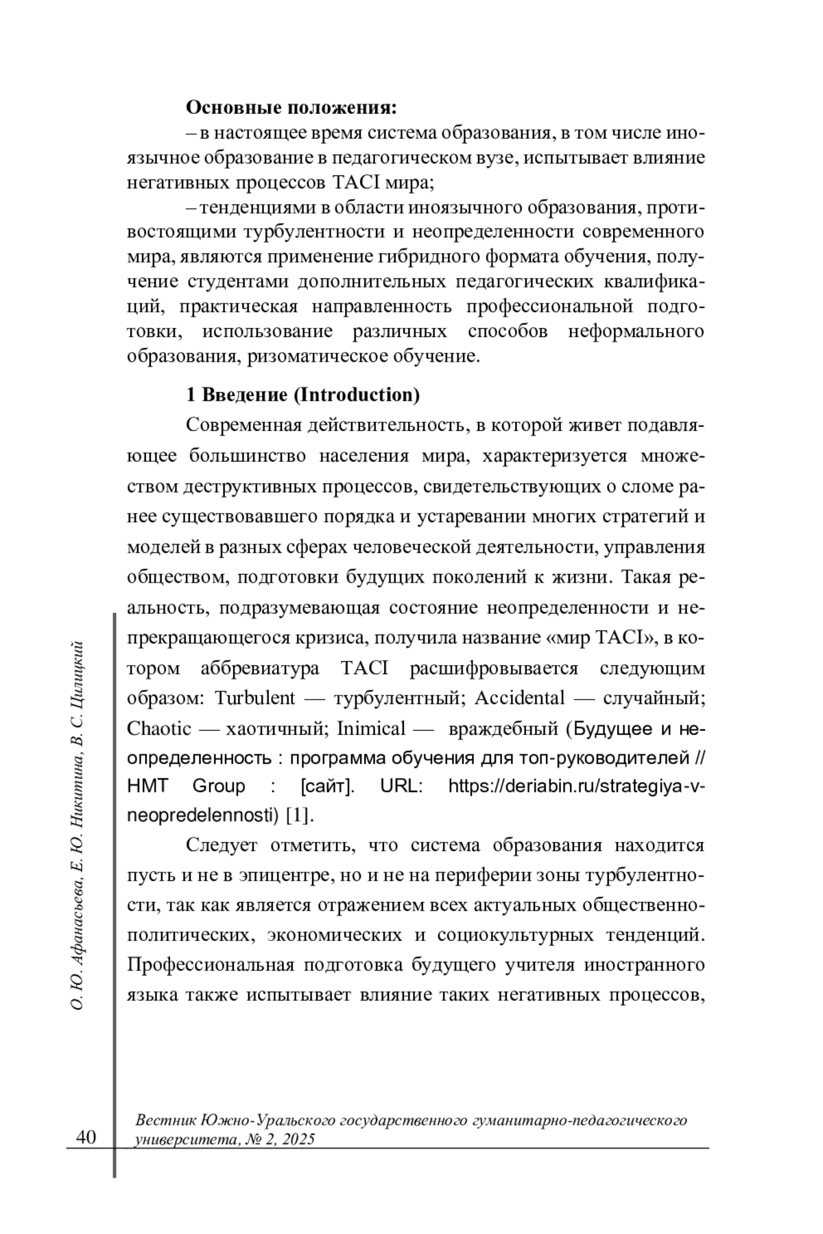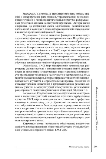 Введение. Введенная совсем недавно в научный оборот аббревиатура TACI относится к современному миру, в котором наблюдаются глобальная турбулентность, хаос, политическая и социальная напряженность. При этом новая реальность не может не затронуть систему образования и в частности — профессиональную подготовку будущих учителей. Однако идея TACI мира не отвергает возможности создания нового мира силами поколения, обладающего компетенциями, необходимыми для проведения радикальных трансформаций. Цель данной статьи — рассмотреть и проанализировать пути преодоления кризисных тенденций в иноязычном образовании в педагогическом вузе.