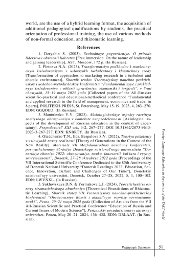 5. Суховская Д. Н., Ермакова Л. И. Теоретические основы ризоматического обучения // Образование России и актуальные вопросы современной науки: сборник статей VII Всероссийской научно-практической конференции, Пенза, 20-21 мая 2024 года. Пенза: Пензенский государственный аграрный университет, 2024. С. 436-438. EDN: DRLAAT