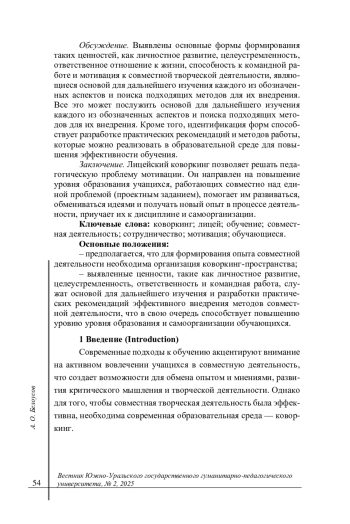 Заключение. Лицейский коворкинг позволяет решать педагогическую проблему мотивации. Он направлен на повышение уровня образования учащихся, работающих совместно над единой проблемой (проектным заданием), помогает им развиваться, обмениваться идеями и получать новый опыт в процессе деятельности, приучает их к дисциплине и самоорганизации. Основные положения: - предполагается, что для формирования опыта совместной деятельности необходима организация коворкинг-пространства; - выявленные ценности, такие как личностное развитие, целеустремленность, ответственность и командная работа, служат основой для дальнейшего изучения и разработки практических рекомендаций эффективного внедрения методов совместной деятельности, что в свою очередь способствует повышению уровню уровня образования и самоорганизации обучающихся.