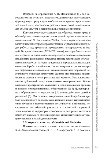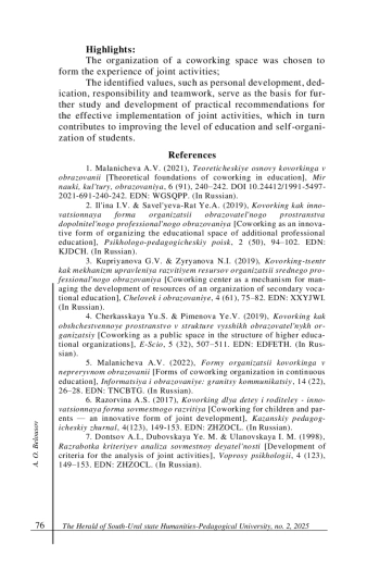 1. Маланичева А В. Теоретические основы коворкинга в образовании // Мир науки, культуры, образования. 2021. № 6 (91). С. 240-242. DOI: 10.24412/1991-5497-2021-691-240-242 EDN: WGSQPP