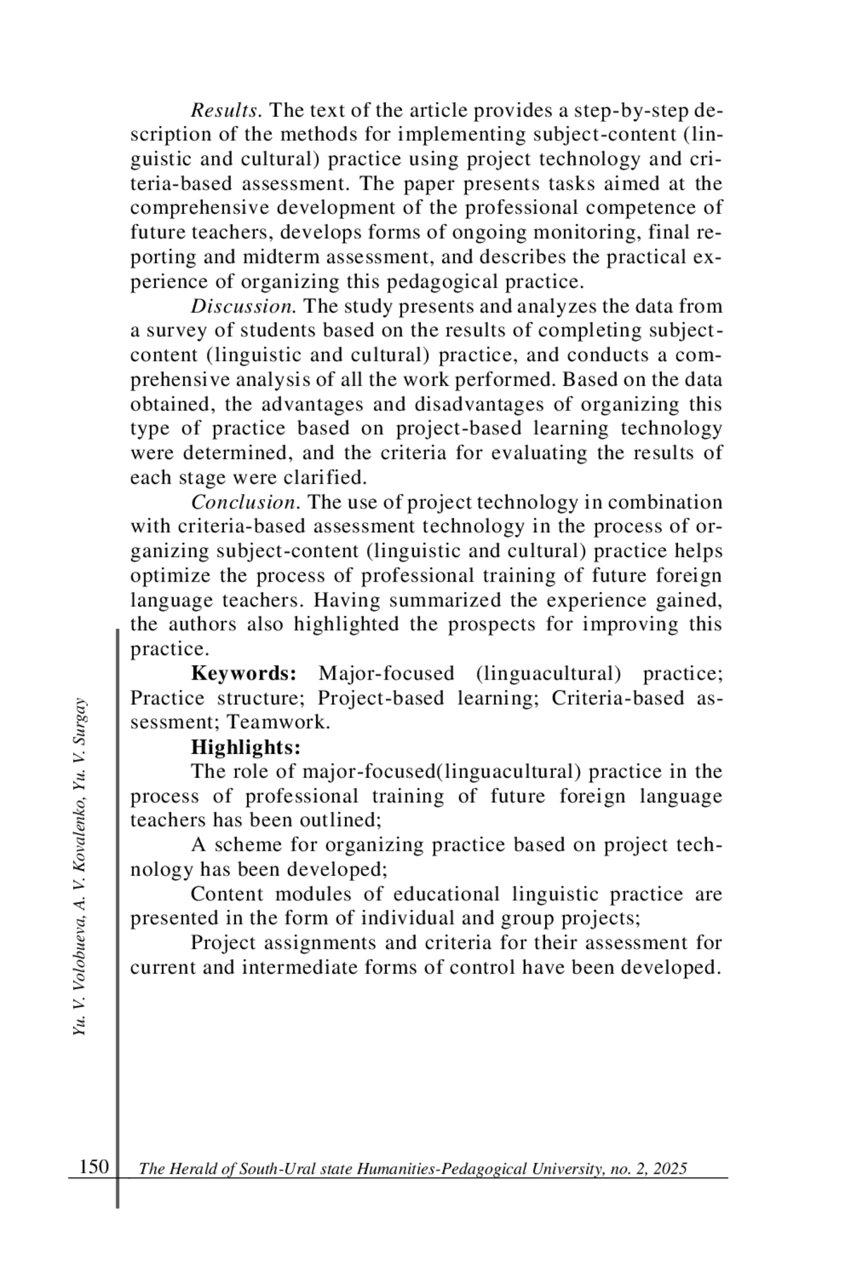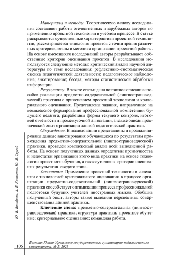 Обсуждение. В исследовании представлены и проанализированы данные анкетирования обучающихся по результатам прохождения предметно-содержательной (лингвострановедческой) практики, проведён комплексный анализ всей выполненной работы. На основе полученных данных определены преимущества и недостатки организации этого вида практики на основе технологии проектного обучения, а также уточнены критерии оценивания результатов каждого этапа.
