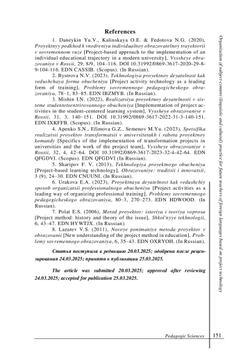 1. Данейкин Ю. В., Калинская О. Е., Федотова Н. Г. Проектный подход к внедрению индивидуальной образовательной траектории в современном вузе // Высшее образование в России. 2020. Т. 29, № 8/9. С. 104-116. 10.31992/0869-3617-2020-29-8-9-104-116. (Scopus). DOI: 10.31992/0869-3617-2020-29-8-9-104-116.Scopus EDN: CASSIB