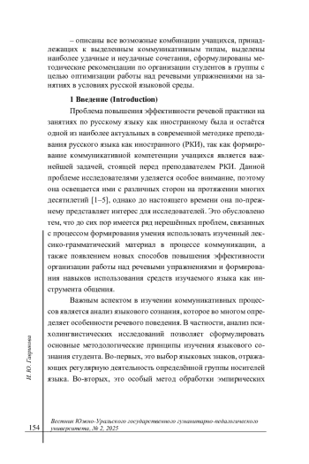 Материалы и методы. Материалы статьи основаны на двенадцатилетнем педагогическом опыте автора, полученном в Московском физико-техническом институте. В исследовании использовались методы педагогического наблюдения, анализа речевого поведения студентов, а также группировка учащихся по коммуникативным типам. Основное внимание уделено речевым упражнениям, таким как диалог, полилог и дискуссия, которые способствуют развитию коммуникативных навыков. Также в работе над исследованием использовались следующие методы: анализ теоретической литературы по теме, касающейся способов организации речевой практики на занятиях по русскому языку как иностранному, типологии речевых упражнений и т. д.